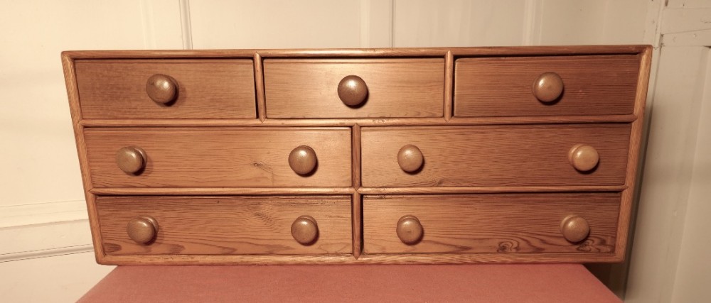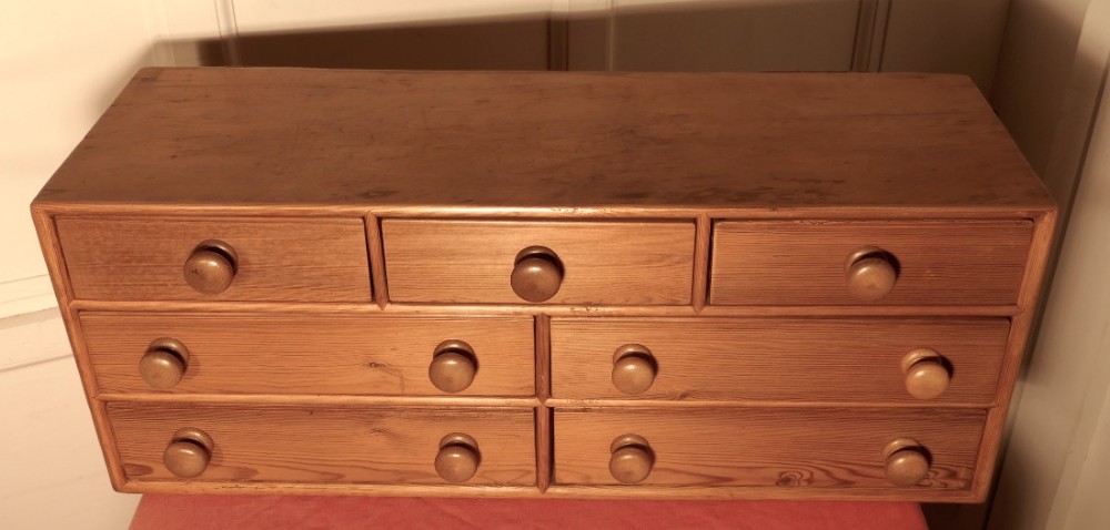 Der Schrank hat eine ungewöhnliche Schubladenkombination: Der Schrank verfügt über 3 Schubladenreihen. Die beiden untersten bestehen aus jeweils 2, die oberste aus 3 Schubladen. Insgesamt hat er somit 7 Schubladen.