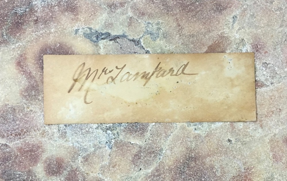 die Unterseite der Marmorplatte mit dem handschriftlichen Etikett des 19. Jahrhunderts, bezeichnet "Herr Lampard".