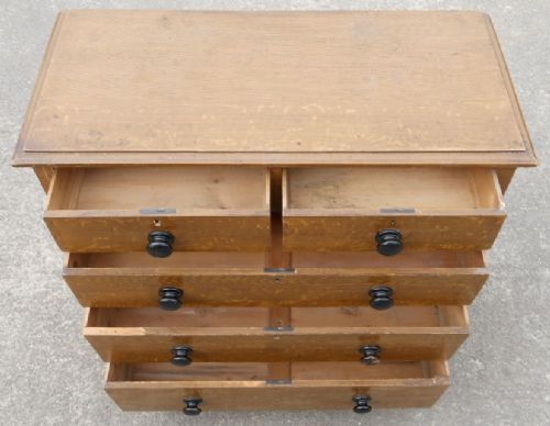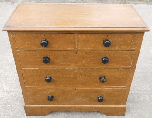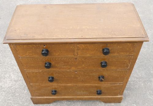 Diese viktorianische Kommode aus Kiefernholz stammt circa aus dem Jahr 1860. Die englische Massivholz Kommode steht auf erhöhten Beinen und hat noch die originalen Keramikgriffe. Es gibt insgesamt fünf Schubladen, davon sind drei groß und zwei klein. Die Weichholz Kommode weist kleine Gebrauchsspuren auf.