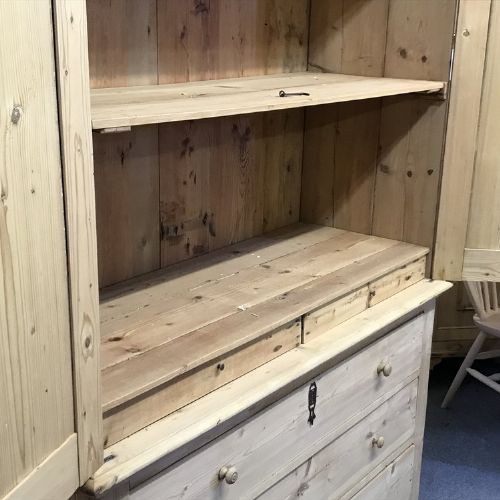 Der Schrank wurde vor kurzem von seiner ursprünglichen Farbe befreit, so dass das saubere Holz zum Vorschein kommt. Der Schrank ist bereit für das Wachsen oder das Malen.