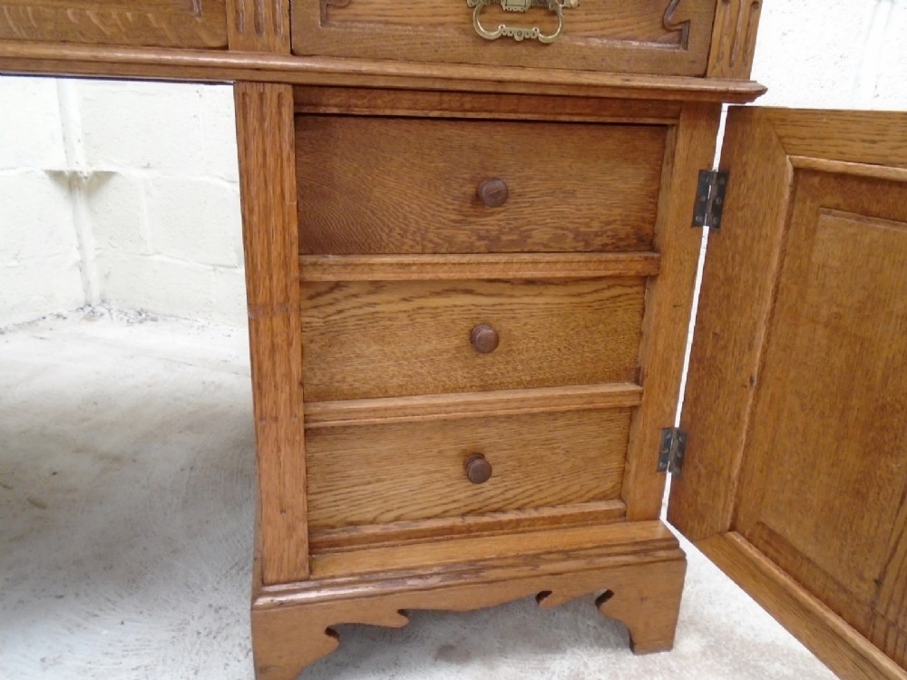 fabelhafte Details; geschnitzte Tür- und Schubladenfronten, Messinggriffe und Rosetten, getäfelte Seiten und Rückseite. ein schöner und ungewöhnlicher Schreibtisch.