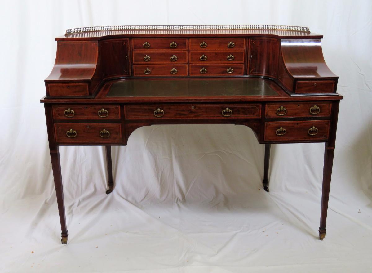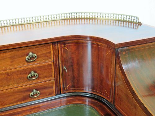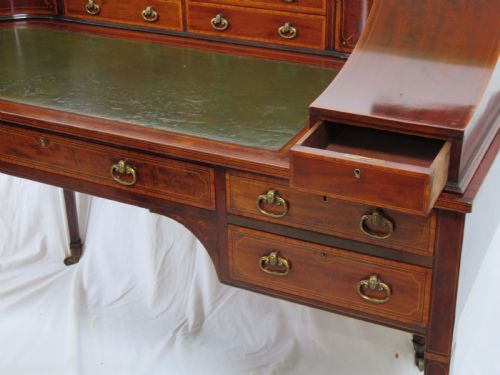 Der Schreibtisch steht auf eckigen, sich verjüngenden Beinen mit Messingkappen und Rollen (eine Rolle wurde ersetzt). Es verfügt über 13 Schubladen und 2 Schränke und die grüne Lederschreibfläche scheint original zu sein, ebenso wie die Messinggalerie um die Oberseite. Die Schubladen sind mit Hartholz ausgekleidet und werden mit 3 Schlüsseln geliefert.