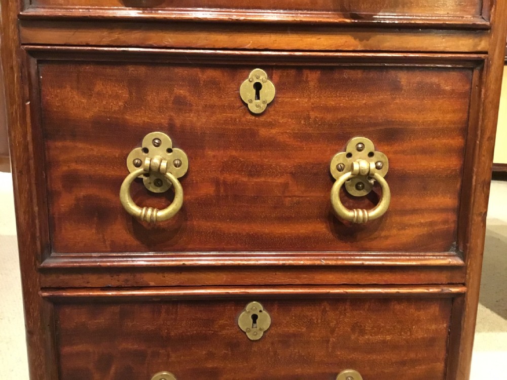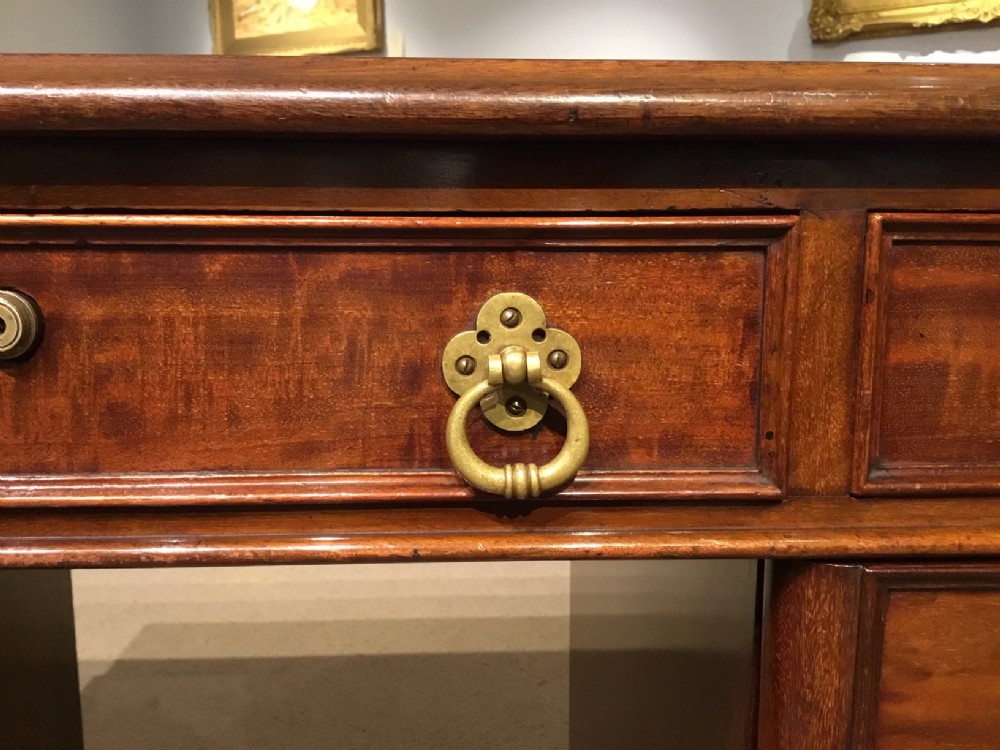 Dieser Schreibtisch ist in einem hervorragenden Originalzustand, gereinigt und gewachst. Die Knieloch-Schublade rastet nicht ein, da sie über ein Bramah-Schloss verfügt und es keinen Schlüssel für dieses Schloss gibt.