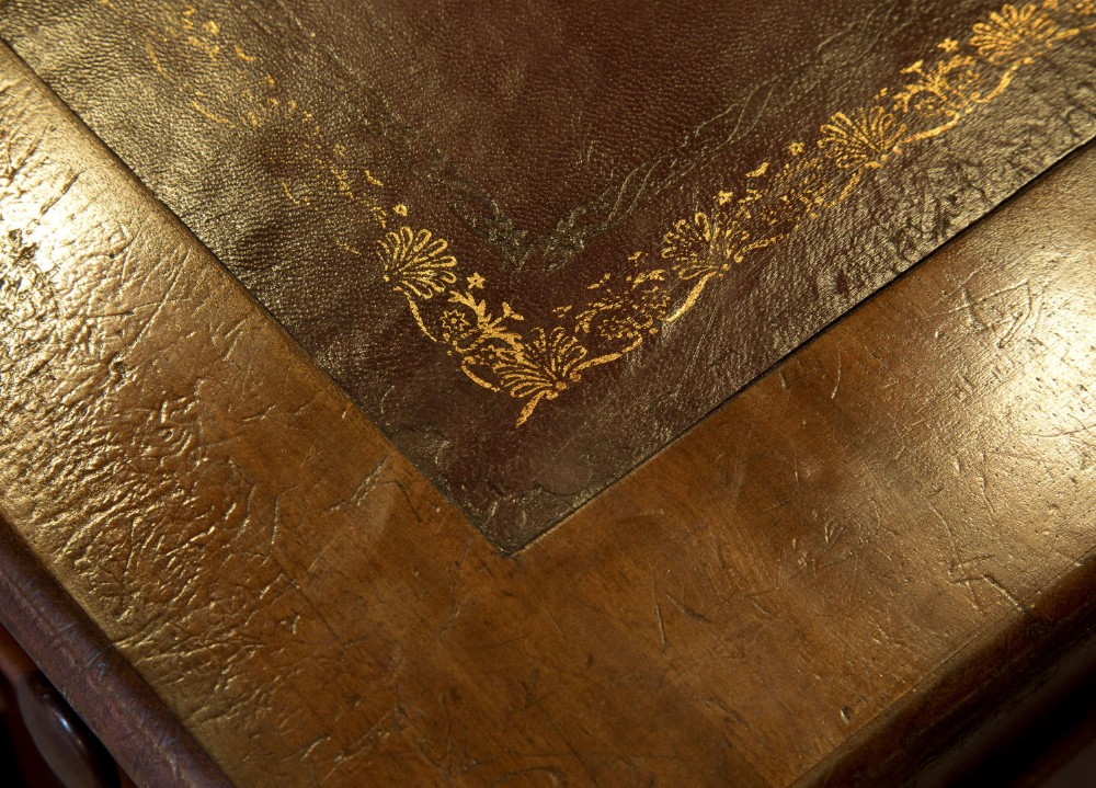 Besitzt 9 Schubladen. In die Schreibfläche wurde kastanienbraunes Leder eingesetzt. Alle originalen Knopfgriffe der Schubladen wurden beibehalten.