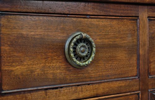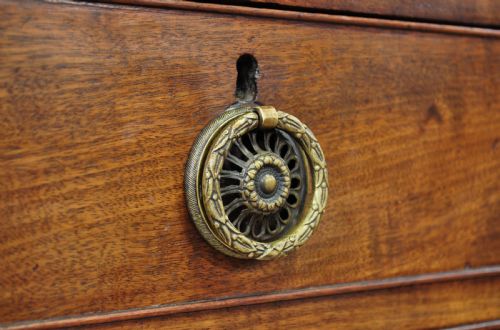 Die Schubladen und die Tür sind mit Messinggriffen ausgestattet, die auf formschönen, runden Messingrückwänden montiert sind.