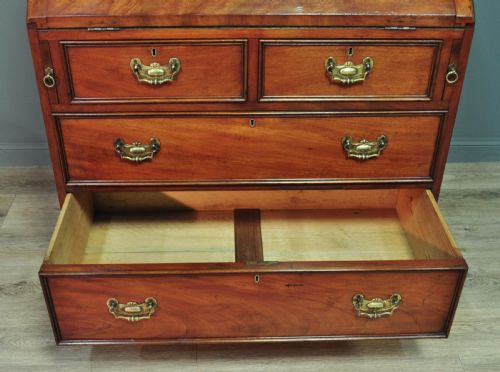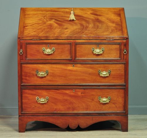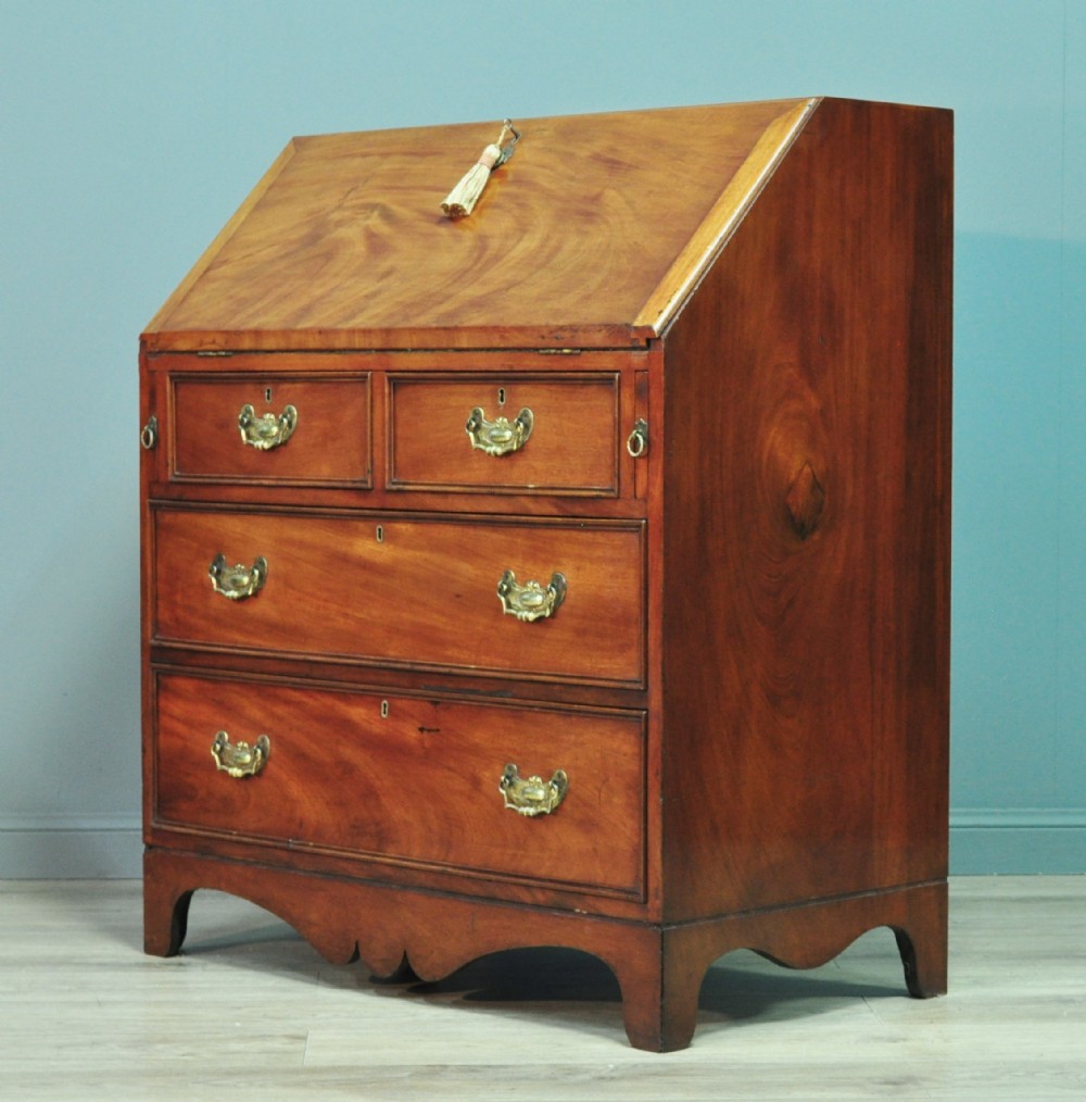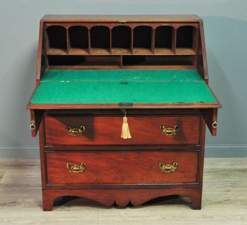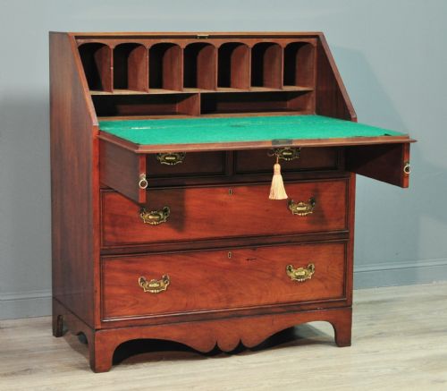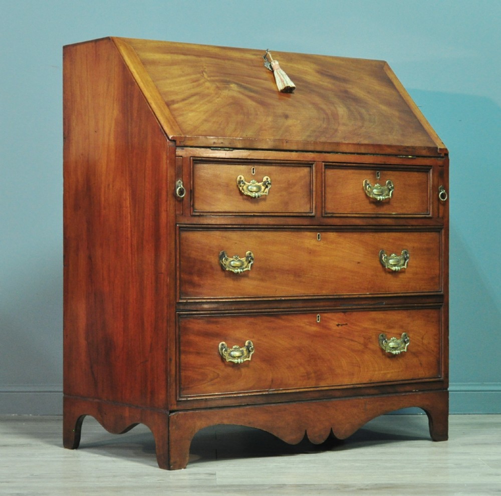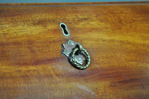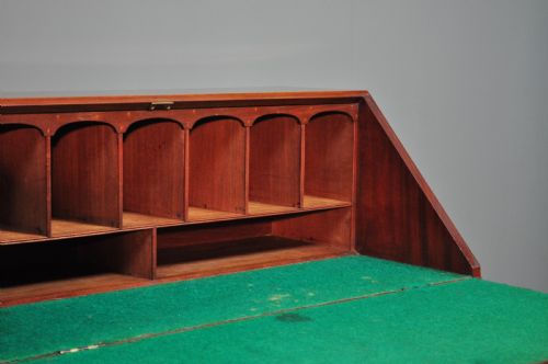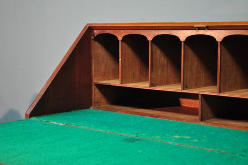 Er befindet sich in einem schönen, soliden Zustand mit altersbedingten Gebrauchsspuren. Es gibt ein paar alte Wurmlöcher an den Rückwänden, die jedoch zur Sicherheit behandelt wurden. Die Büroklappe hat ein Schloss und wird mit einem Schlüssel geliefert, obwohl das Schloss funktioniert, ist es etwas temperamentvoll. Die Oberflächenbeschaffenheit weist einige geringfügige Gebrauchsspuren auf, und die Innenseiten der Schubladen sowie die Rückseite der oberen Oberfläche sind mit ein paar leichten Spuren versehen.