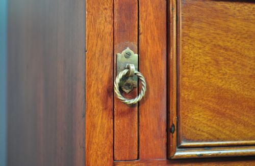 Die Schubladen sind mit Messinggriffen und Schlössern ausgestattet (es wird kein Schlüssel mitgeliefert, ein geeigneter Ersatz sollte jedoch bei Bedarf leicht erhältlich sein).