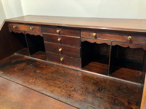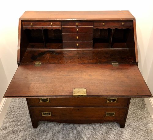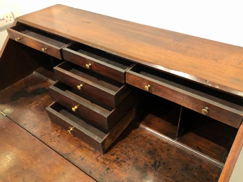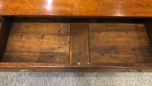 Es ist in gutem Zustand und hat eine wunderbare satte Farbe entwickelt. Das Stück wurde gründlich gereinigt und sanft poliert, wobei die ursprüngliche Patina erhalten blieb. es ist von guter qualität und besteht aus massivem Mahagoni. Die Schubladen laufen reibungslos und sind im Allgemeinen sauber und ordentlich. Es gibt einige Alters- und Gebrauchsspuren, einen alten Einriss in der Schrägfront und einige historische Reparaturen, aber nichts Negatives und insgesamt zeigt es sich sehr gut. es ist stark und robust und einsatzbereit.