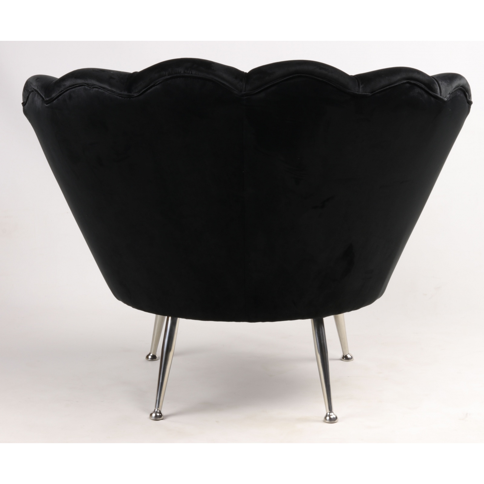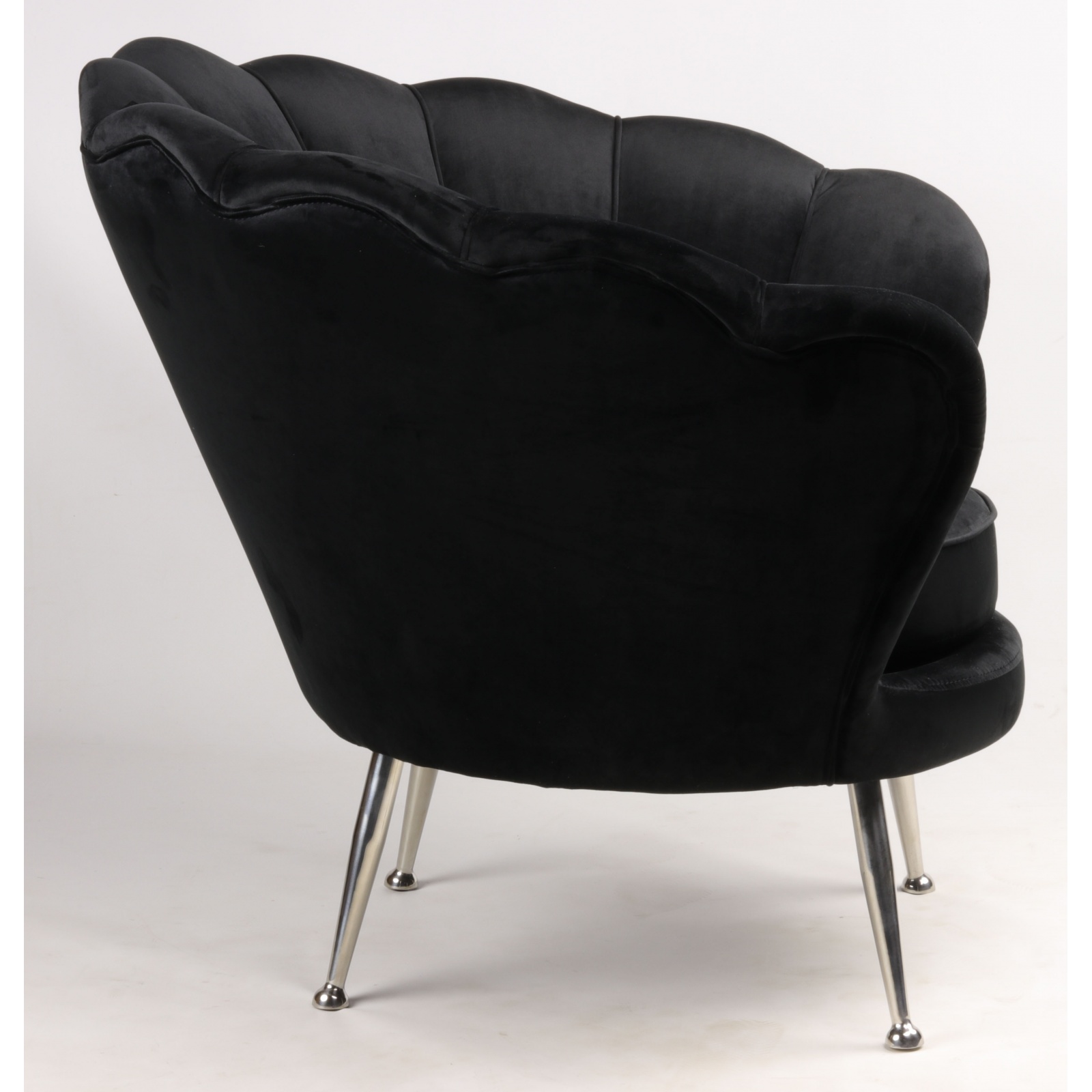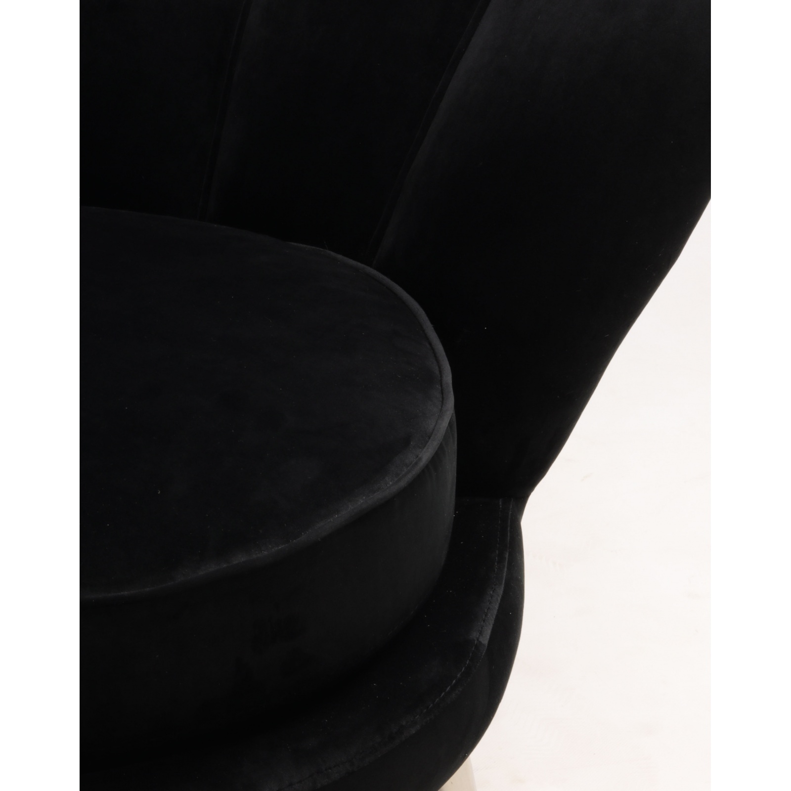 Die hohe, fächerförmige Rückenlehne ist das zentrale Designmerkmal dieses samt sessel schwarz. Die vertikal verlaufenden Steppnähte betonen die florale Form und verleihen dem Sessel Tiefe und Struktur.
