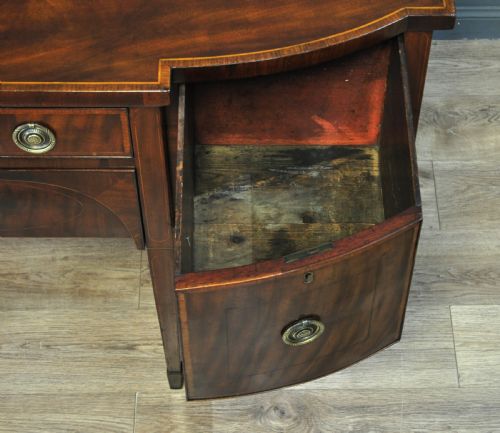 Das Sideboard hat eine Bow Front und besteht aus einer zentralen Knieöffnung mit zwei Schubladen, die an jeder Seite von einer jeweils weiteren sehr tiefen Schublade flankiert werden. Die Tischplatte zeigt schöne, filigrane Intarsien.