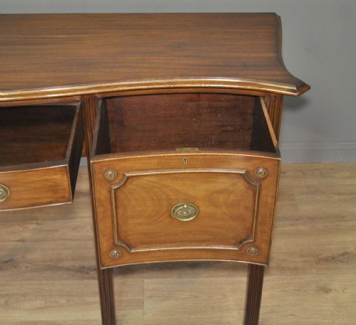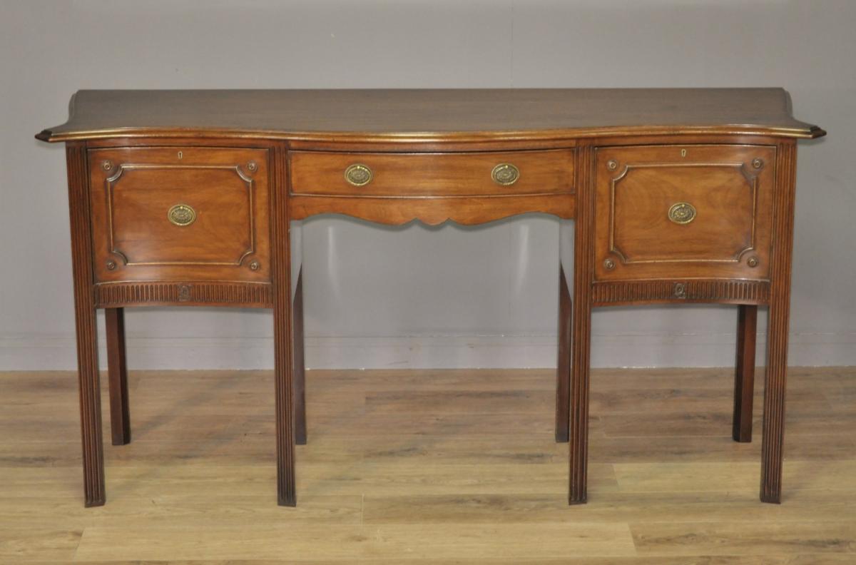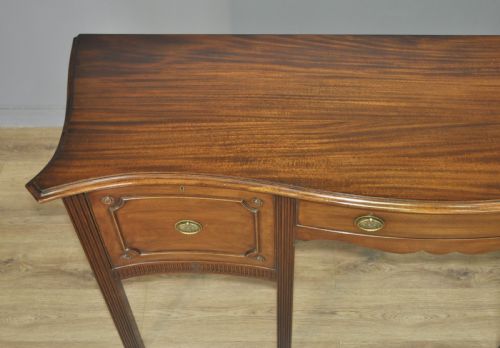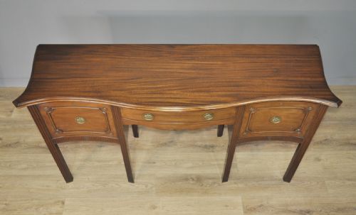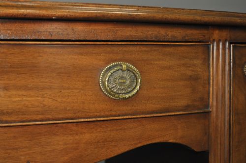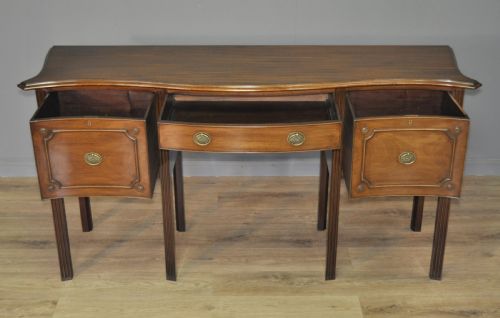 Das Sideboard hat eine Serpentinenfront. Es gibt eine zentrale Schublade, die auf beiden Seiten von einer großen, tiefen Schublade flankiert wird.