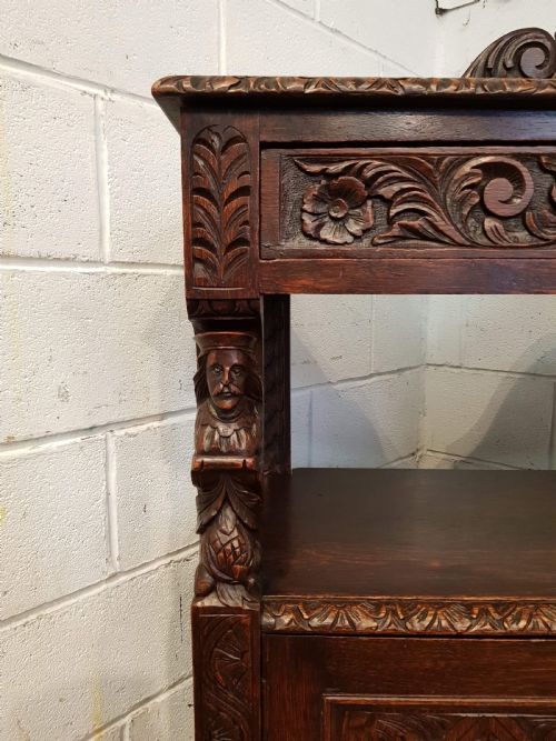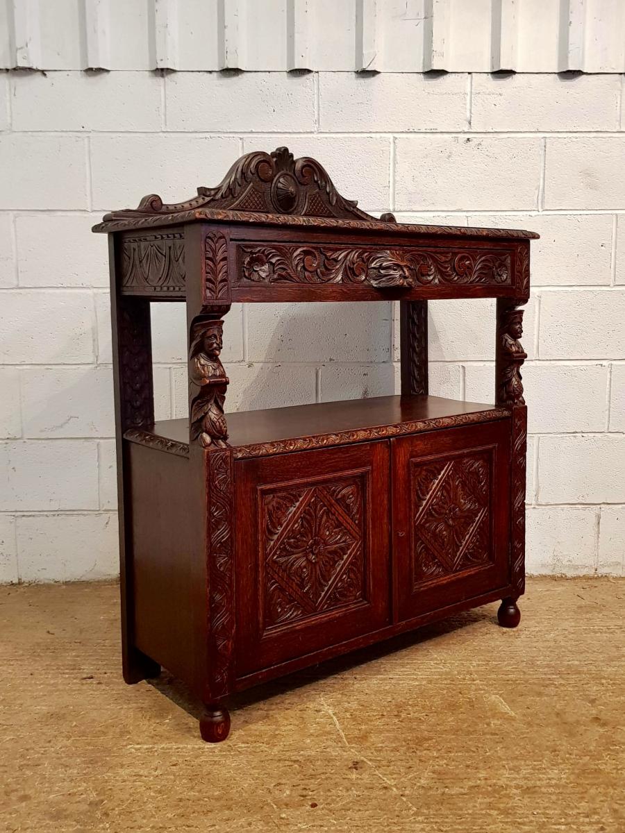 Antikes englisches Massivholz Sideboard Eiche Buffettisch Cernunnos Dionysos Pan