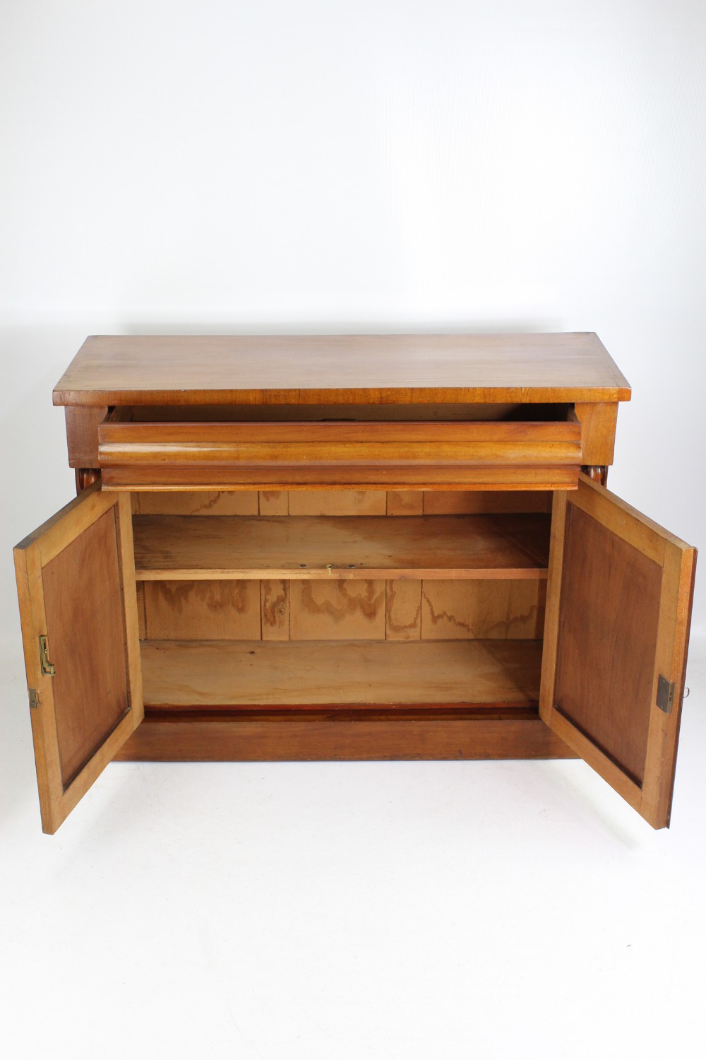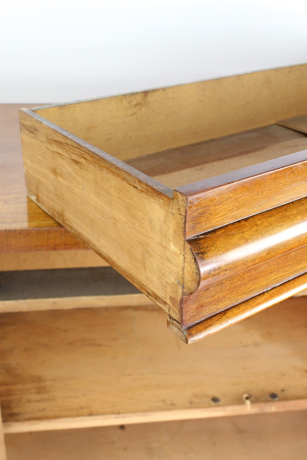 Guter Zustand, mit allgemeinen altersbedingten Gebrauchsspuren. Hätte ursprünglich eine Galerie oder einen Spiegelaufsatz an der Rückwand gehabt.
