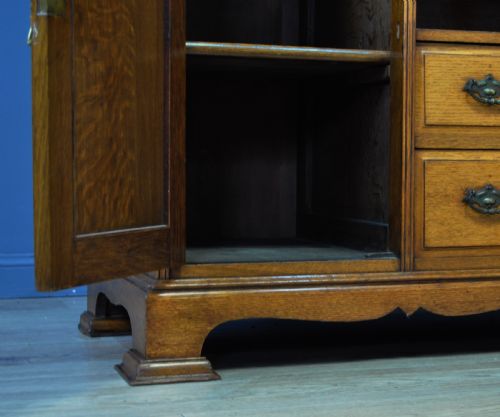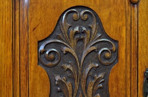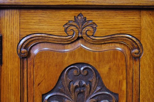 der Boden besteht aus zwei mittleren Schubladen und einem Regal, die von seitlich angeschlagenen tTüren flankiert werden, die unter zwei breiten Schubladen sitzen. Die Schranktüren haben sehr kunstvoll geschnitzte Paneele. Die Schränke sind jeweils mit einem mittig montierten herausnehmbaren Regal ausgestattet.