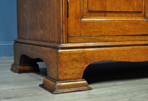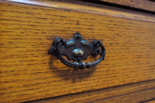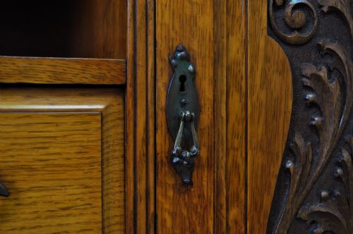 Die Schranktüren und Schubladen sind mit Fallgriffen versehen, die auf formschönen Rückwänden montiert sind. Die obersten Schubladen sind von reich verzierten Schnitzereien flankiert. Die Türen sind mit Schlössern versehen (kein Schlüssel wird mitgeliefert, ein geeigneter Ersatz sollte jedoch bei Bedarf leicht erhältlich sein). Die Türen sind mit später hinzugefügten Verschlüssen versehen.