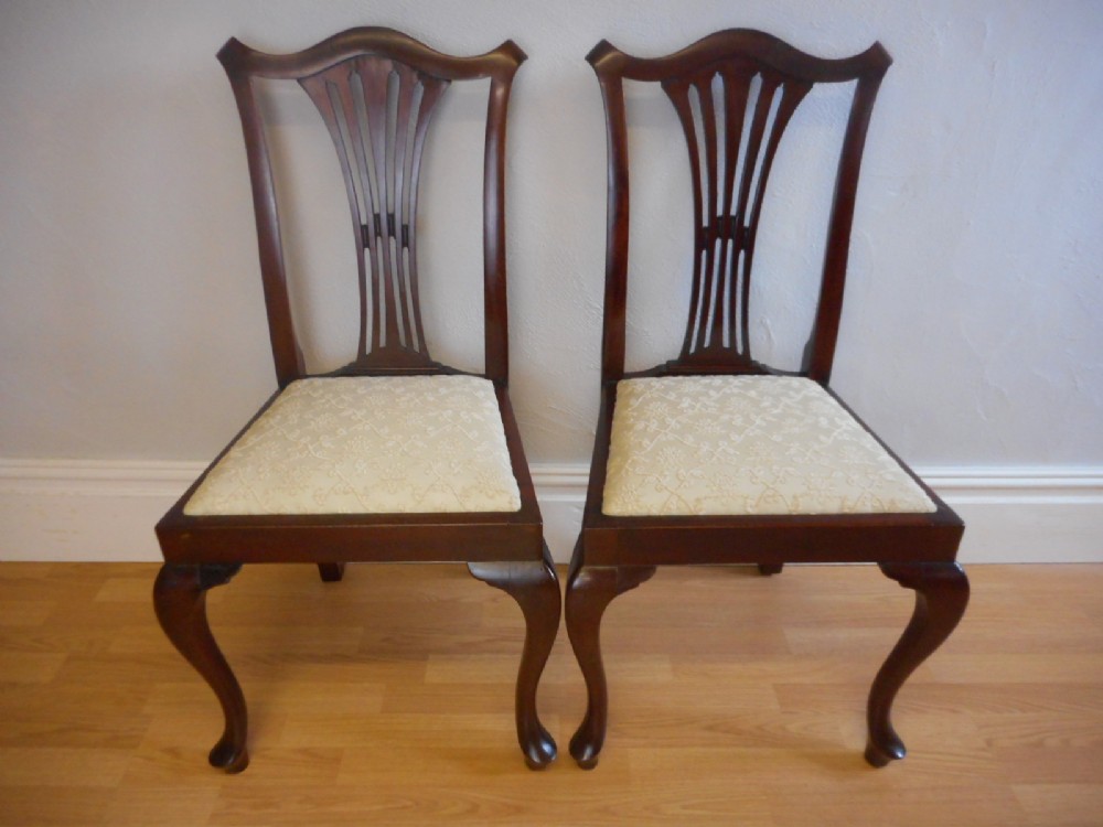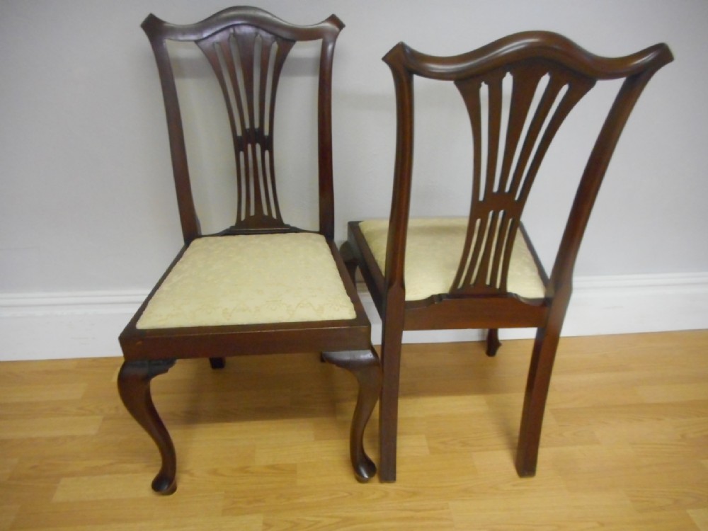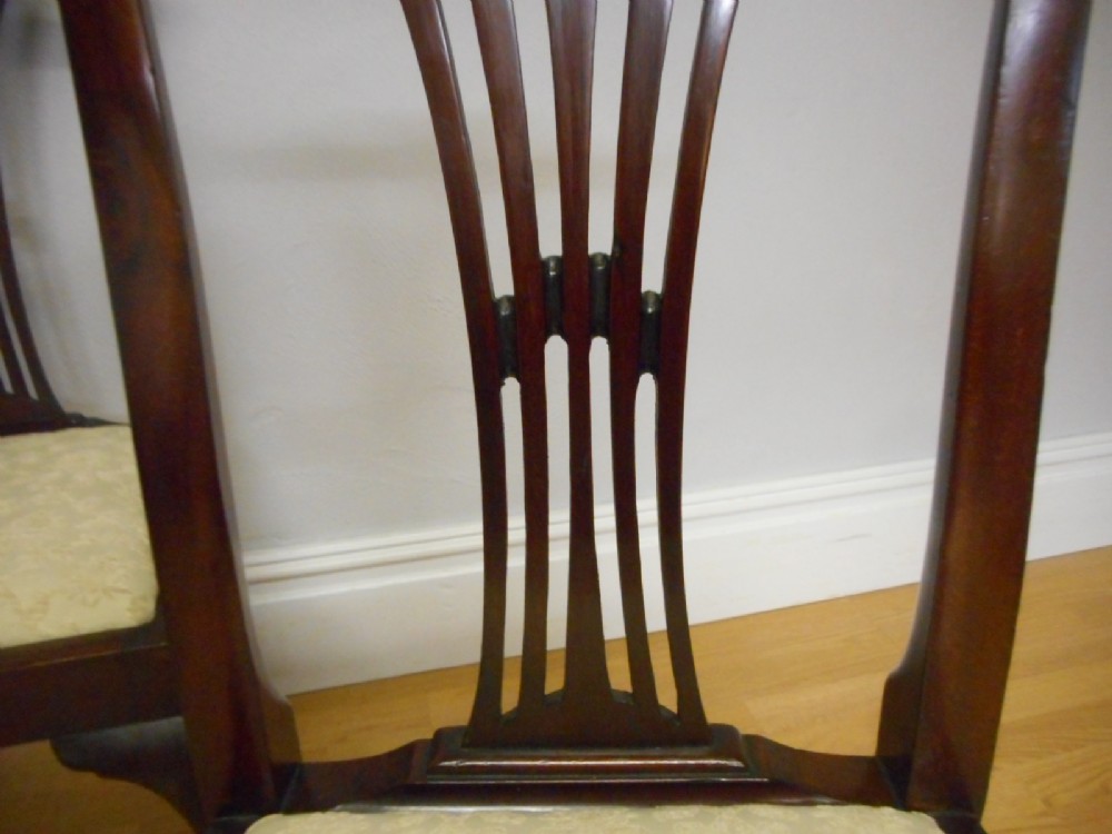 Die Stühle mit Original-Glanz und Patina haben eine kräftige Mahagonifarbe (siehe Bilder).