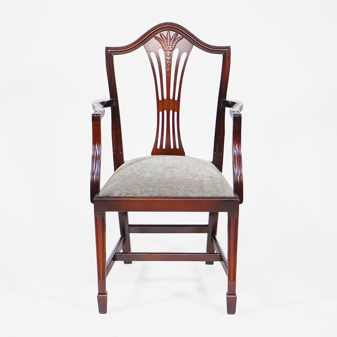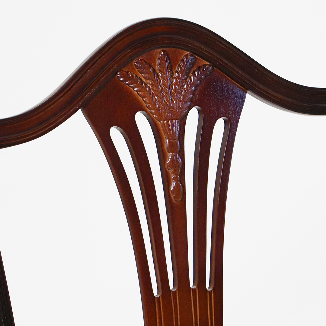 Der angebotene "Hepplewhite Wheatear" Esszimmerstuhl gilt als einer der bekanntesten, englischen Stühle. Die aufwändig geschnitzte Rückenlehne und auch die Spatenbeine zeichnen diesen Stuhl aus.