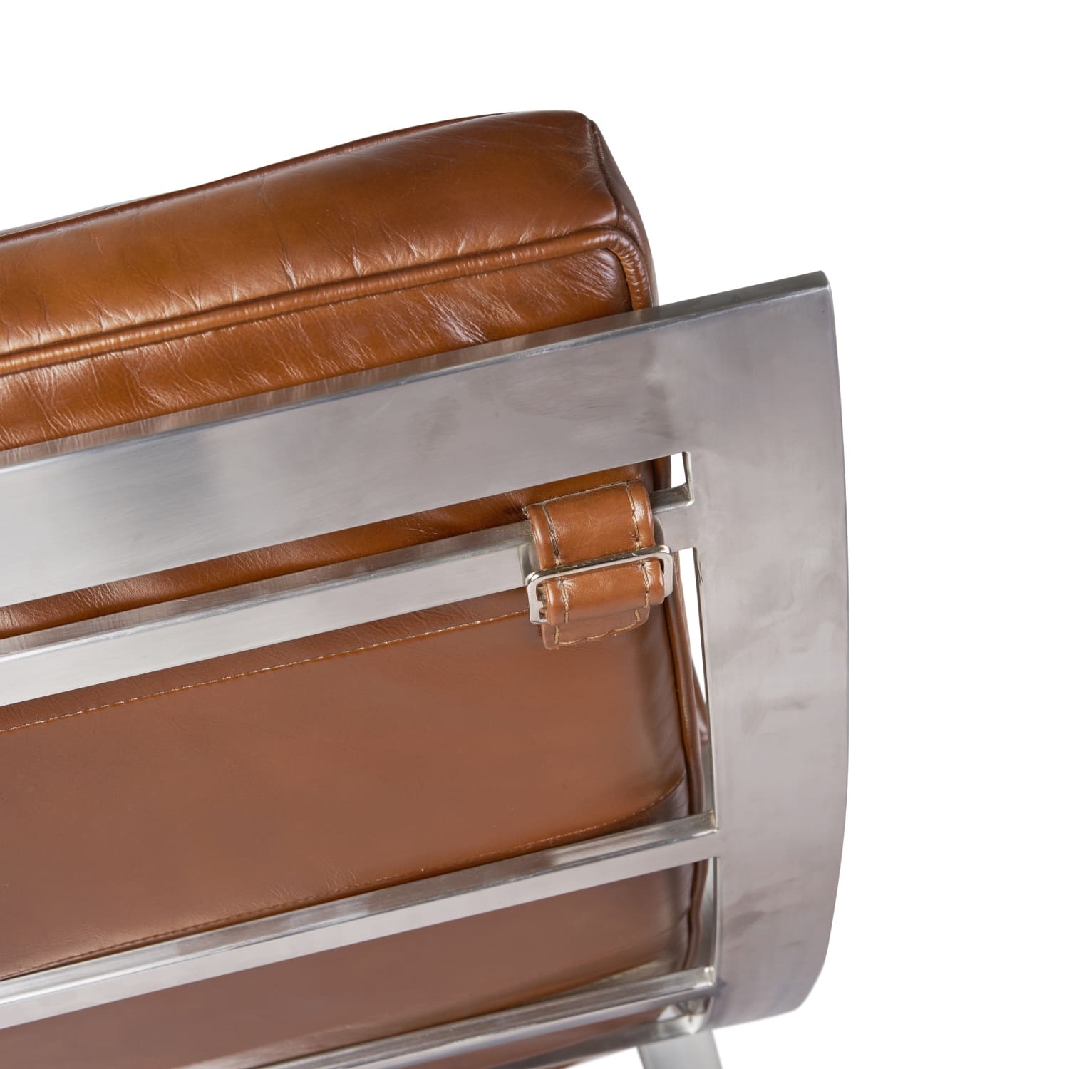 Die klare Linienführung und die Kombination aus Leder und Edelstahl erinnern an klassische Entwürfe der Moderne. Als Bauhaus Sessel interpretiert der „MADRID“ die ikonische Formsprache neu und verbindet sie mit warmem Materialkontrast.