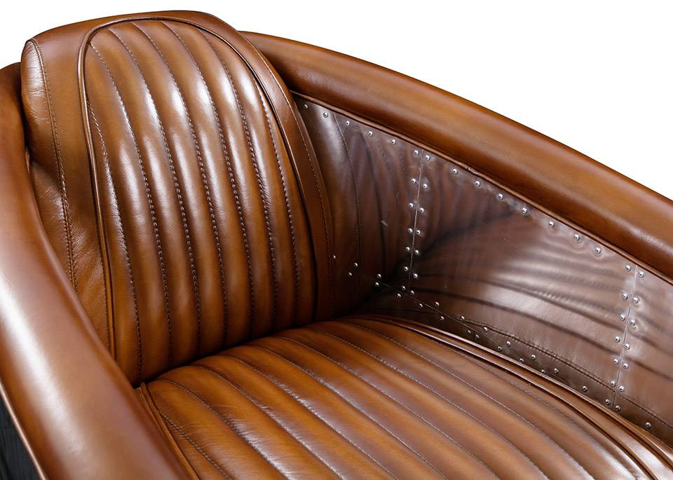 Das Design des Sessels orientiert sich an der Form eines Flugzeugrumpfs. Die charakteristischen Aluminiumplatten mit sichtbaren Nieten sind präzise verarbeitet und verleihen dem Möbel seine unverwechselbare Aviator-Ästhetik. Diese Details erinnern an die Handwerkskunst klassischer Flugzeugkonstruktionen.