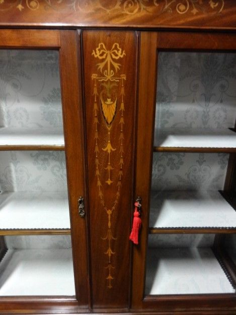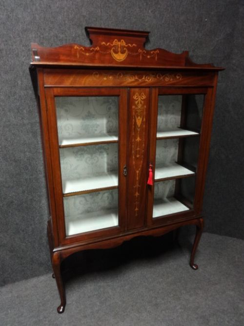 Eine gute edwardian Mahagoni Vitrine mit sehr sauberen Intarsien, abgeschrägten Glastüren, doubliert und in sehr gutem Zustand.