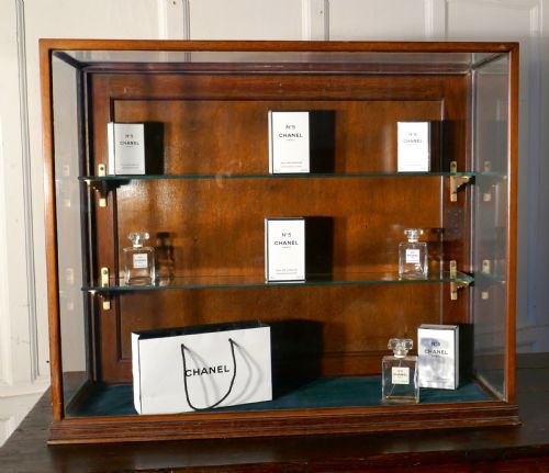 Der Schrank hat auf der Rückseite eine Holztür, im Inneren befinden sich 2 abnehmbare Glasböden und der Unterboden hat eine Samtabdeckung.
