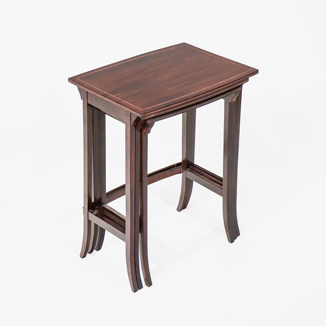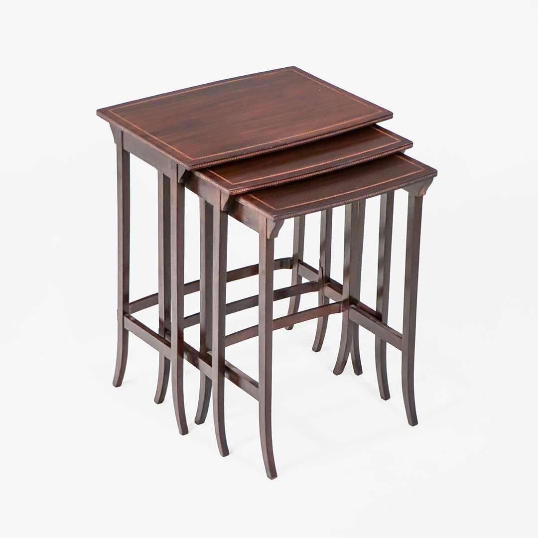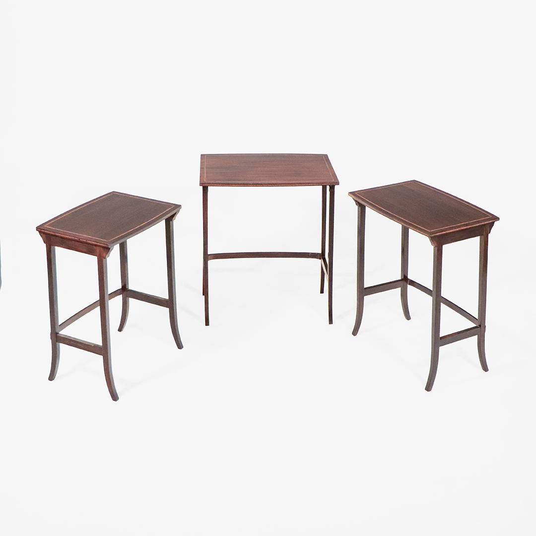 Dieses originale Set antiker Edwardian Satztische stammt aus England und datiert um 1900. Gefertigt aus massivem Mahagoni, überzeugt das Ensemble durch elegante Proportionen, feine Intarsienarbeit und eine besonders harmonische Linienführung.