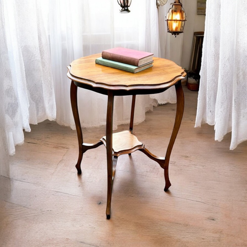 Die Cabriole-Beine verleihen dem Tisch eine elegante Leichtigkeit und sind über eine zweite, kleinere Ablagefläche verbunden – ideal für Bücher, Pflanzen oder dekorative Objekte.