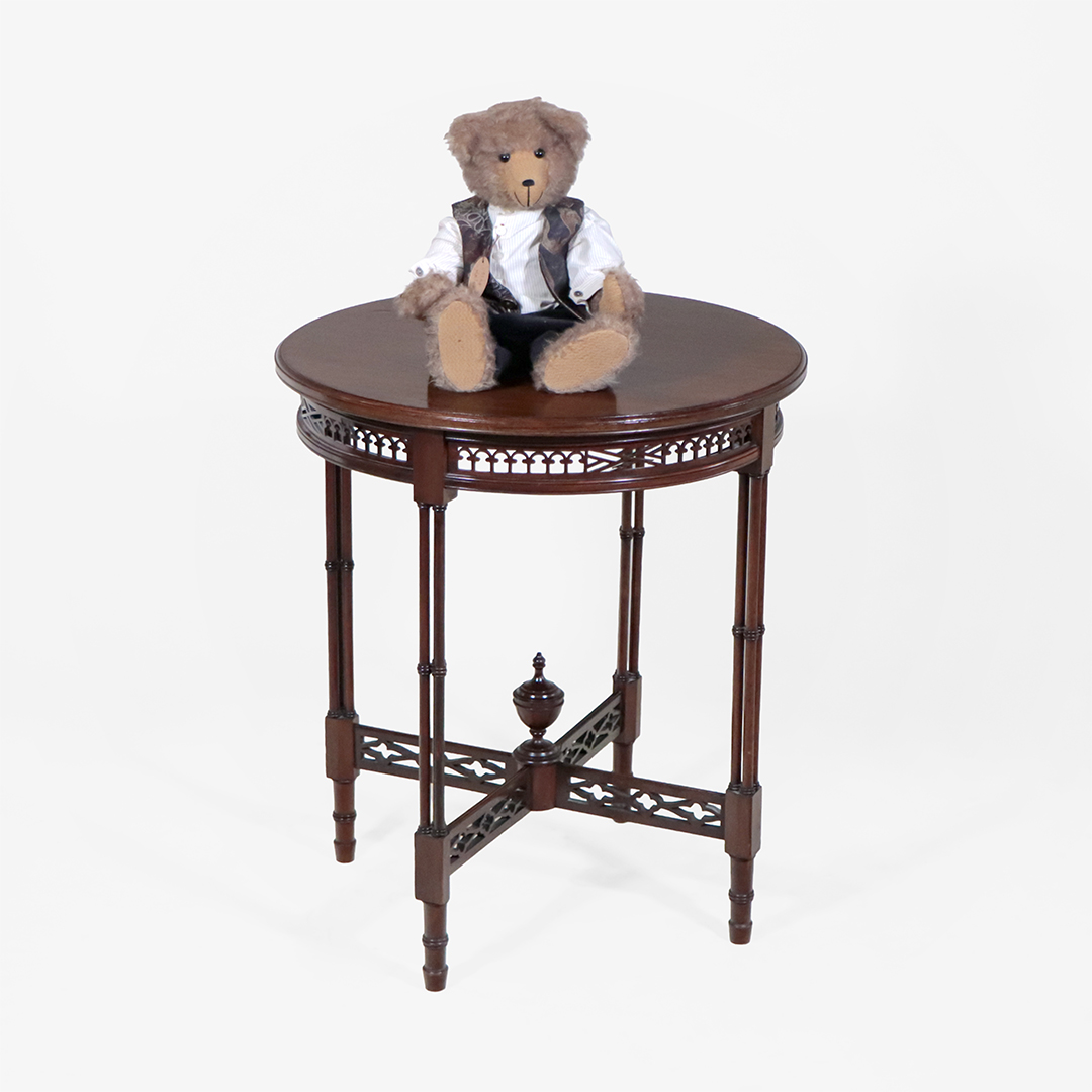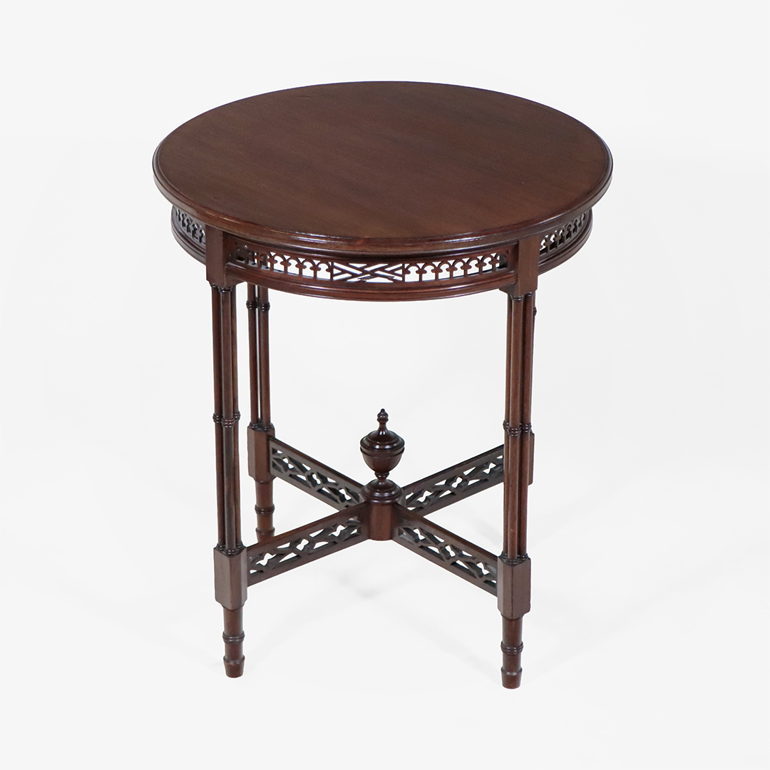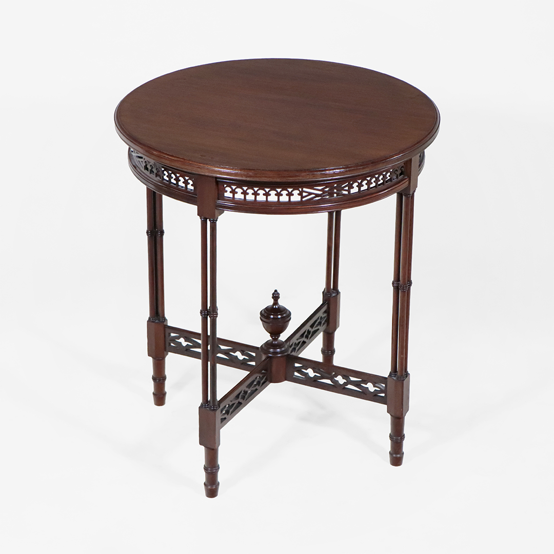 Die runde, massiv gearbeitete Tischplatte besitzt ein fein profiliertes Profil und wird von einem umlaufenden, durchbrochen gearbeiteten Zargenband getragen. Besonders auffällig sind die filigranen gotisch inspirierten Durchbruchmotive, die dem Tisch Leichtigkeit verleihen und typisch für den Chinese Chippendale Stil sind. Diese dekorativen Elemente wirken aus jedem Blickwinkel und unterstreichen die handwerkliche Qualität.