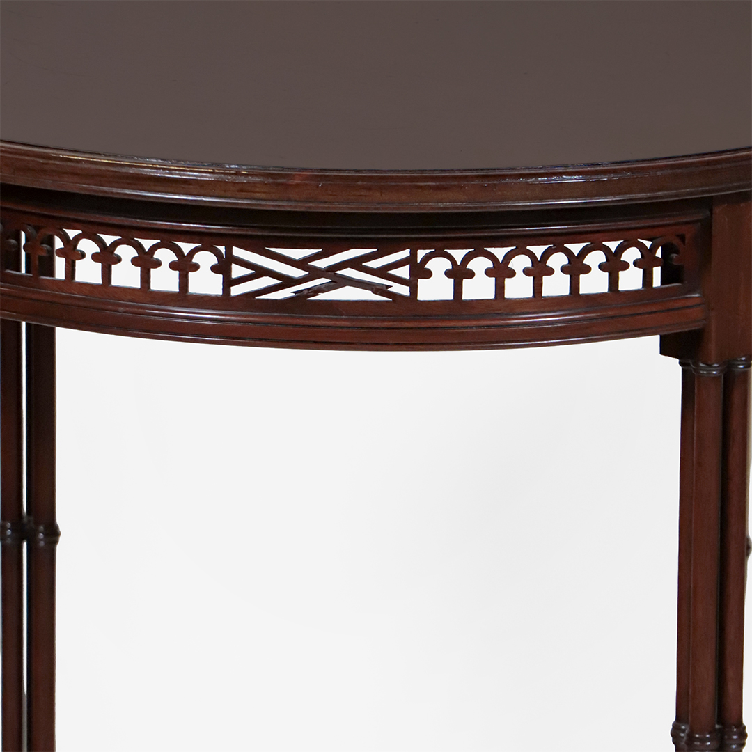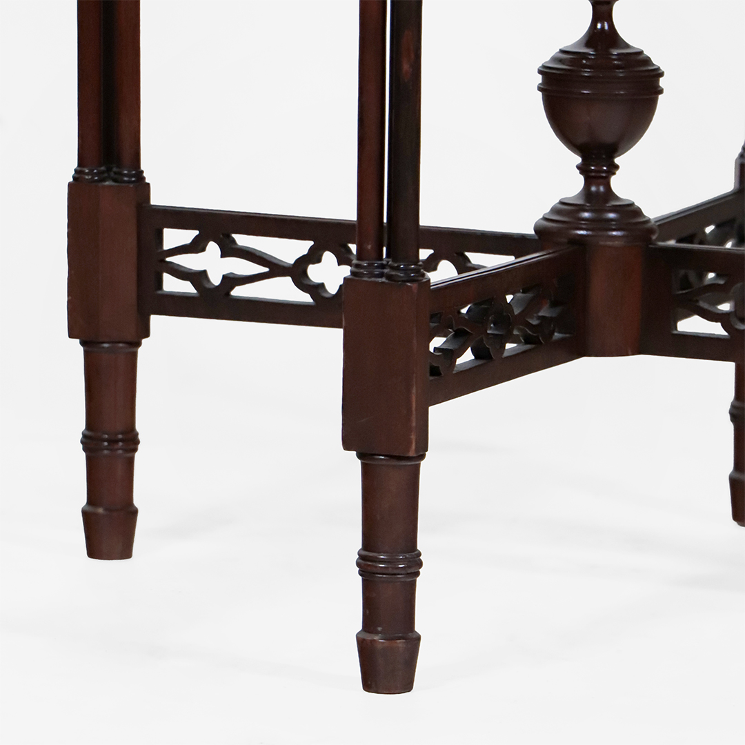 Der Tisch steht auf vier Beinen, die jeweils aus drei schlanken Säulen bestehen und durch kunstvoll gearbeitete Streben miteinander verbunden sind. Die Verbindungen zeigen ebenfalls durchbrochene Verzierungen und laufen in einem zentralen, gedrechselten Zierknauf zusammen. Gefertigt aus massivem Mahagoni und traditionell verarbeitet, steht der Tisch für langlebige Bauweise und authentisches englisches Möbelhandwerk.