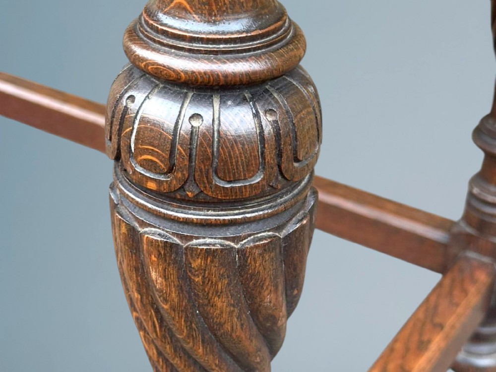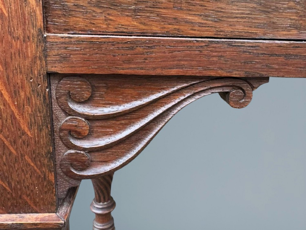 Die gedrechselten und kunstvoll geschnitzten Tischbeine sind ein Beispiel edwardianischer Handwerkskunst. Die fein gearbeiteten Balusterbeine mit spiraliger Verzierung verleihen dem Tisch Eleganz und Stabilität.