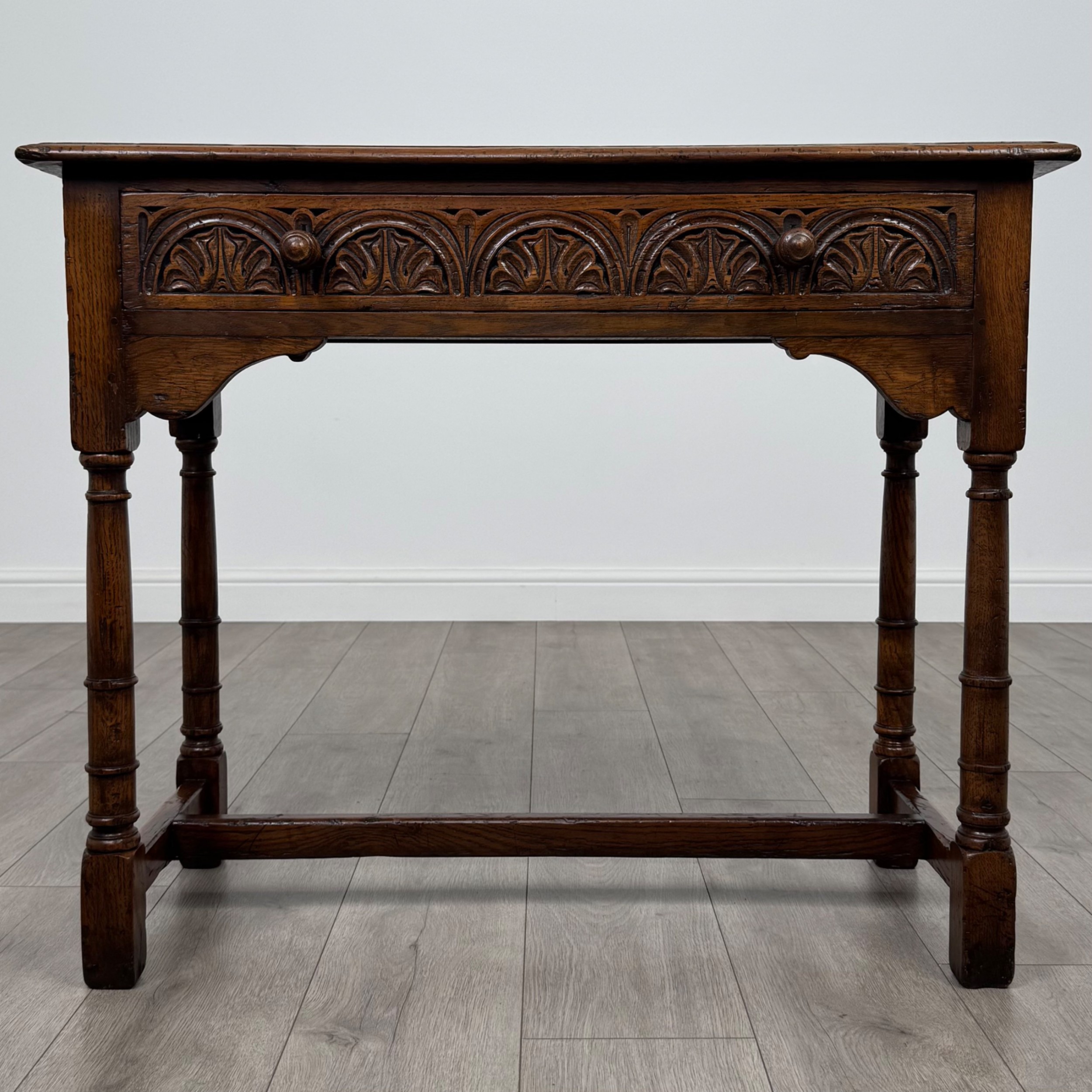 An der Vorderseite befindet sich eine Schublade mit den originalen Knopfgriffen. Die Schubladenfront ist kunstvoll geschnitzt und zeigt die hohe Handwerkskunst dieser Epoche.