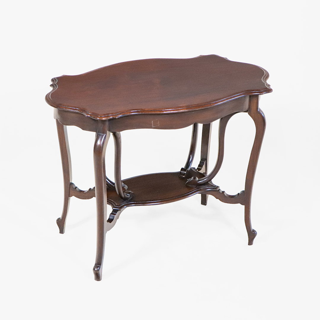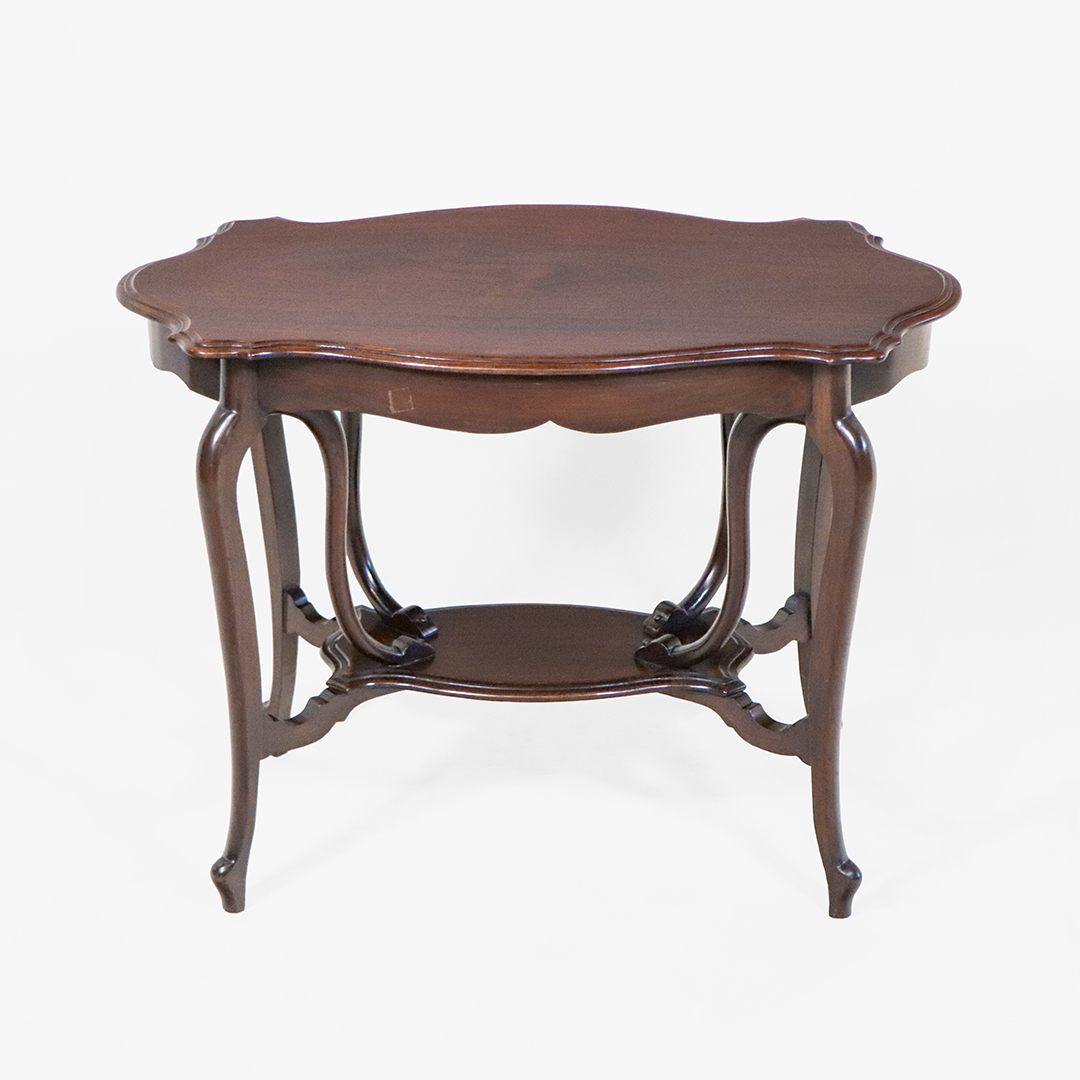 Die sanft geschwungenen Beine gehen fließend in dekorative Verbindungen zur unteren Ablage über. Gerade diese organische Linienführung macht den Tisch auch als Jugendstil Beistelltisch besonders interessant.