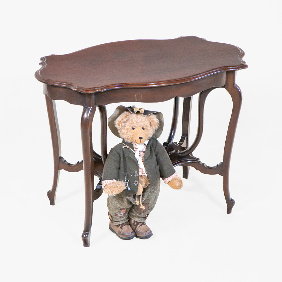 Die profilierte Tischkante betont die geschwungene Form der Platte. Feine Schnitzarbeiten an Beinen und Verbindungsstegen unterstreichen die hochwertige Ausführung.