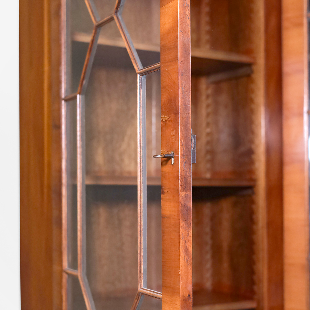 Im oberen Bereich befinden sich vier große Glastüren mit klassischer 13-Pane-Verglasung. Jede einzelne Scheibe ist separat eingesetzt und wird durch feine Sprossen gegliedert – typisch für englische Bücherschränke dieser Bauart.