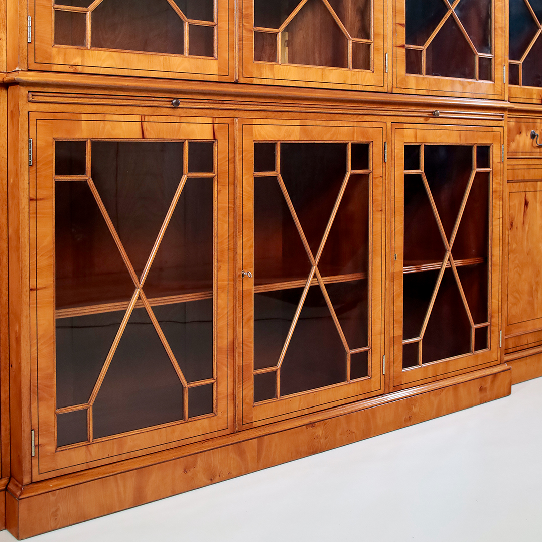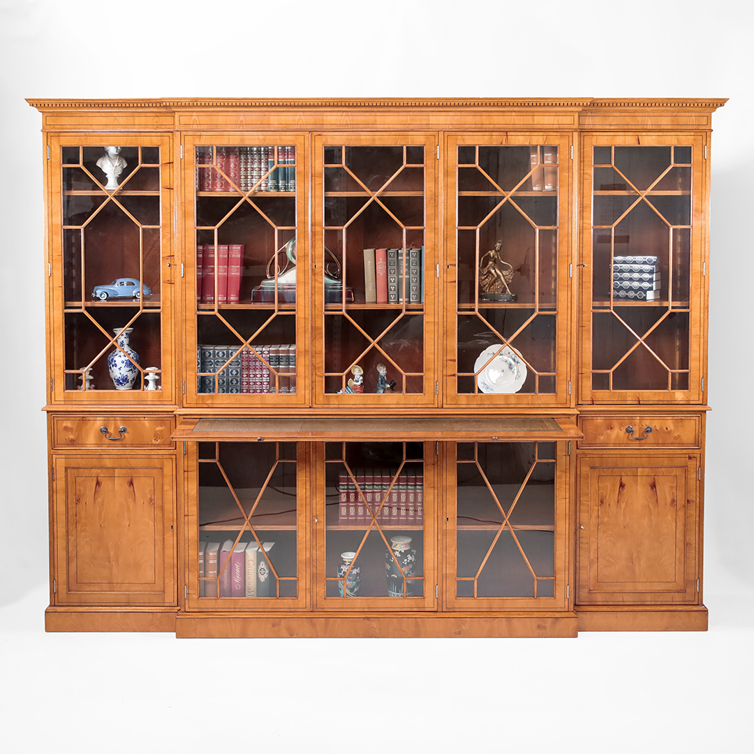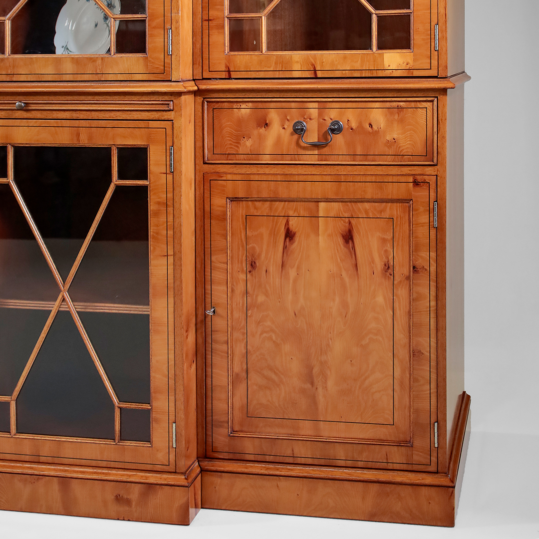 Englischer Breakfront Bücherschrank aus Eibe – großer Bibliotheksschrank mit Vitrinenaufsatz