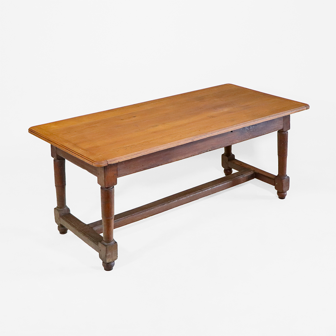 Die stabile Fußkonstruktion mit klassischer H-Frame-Verbindung sorgt für sicheren Stand und betont den traditionellen Landhausstil. Der Tisch ist nicht nur optisch ein Highlight, sondern auch langlebig und funktional.