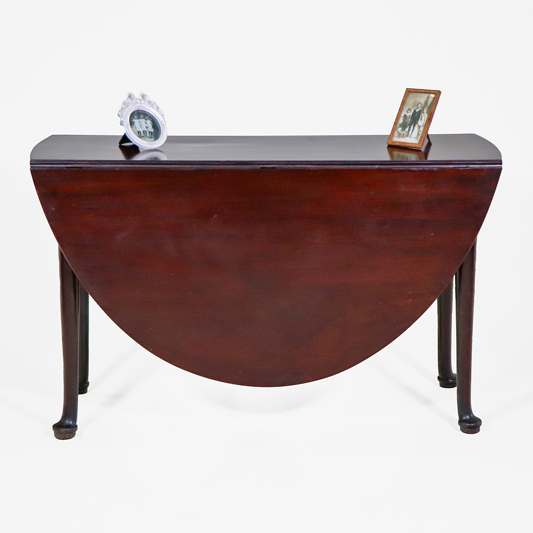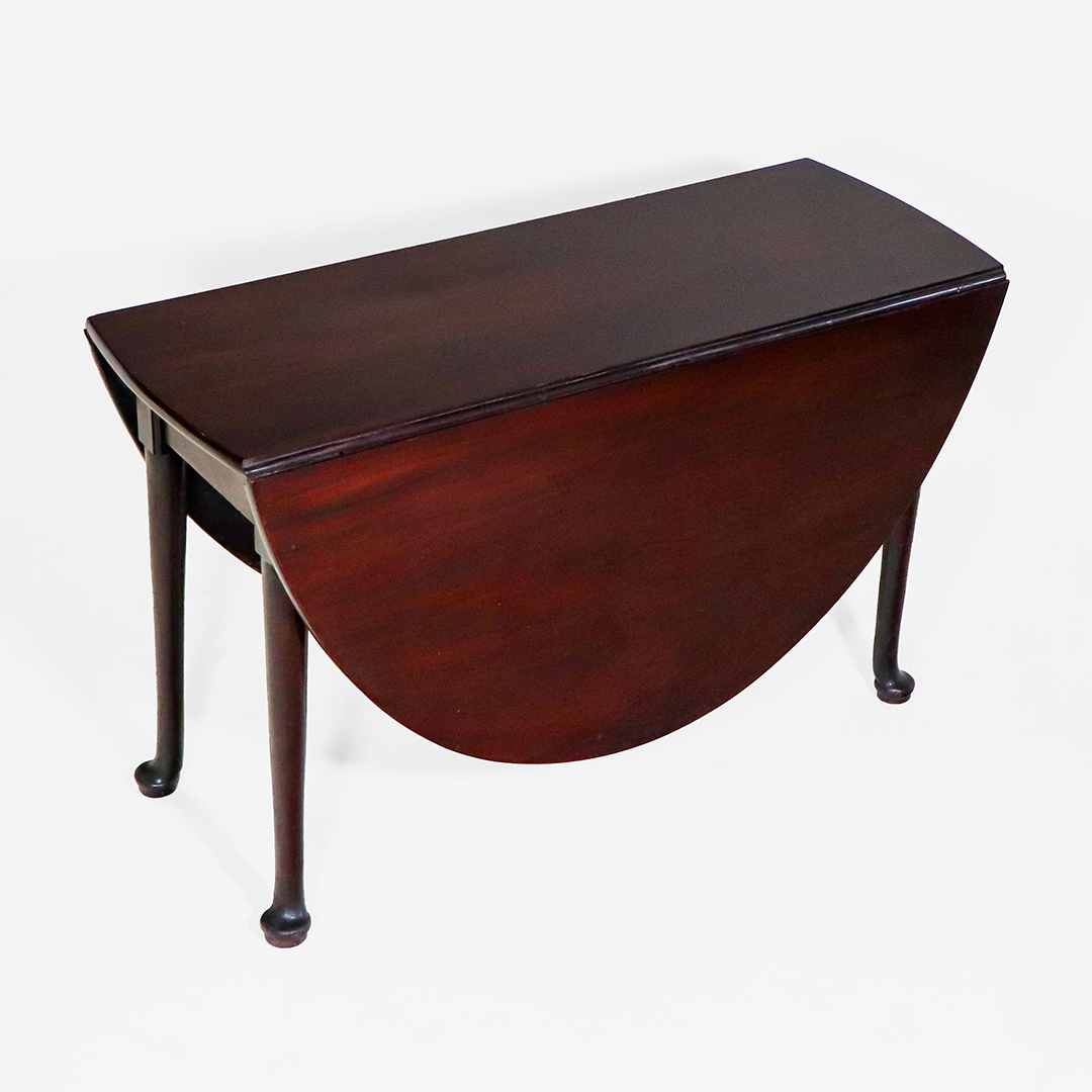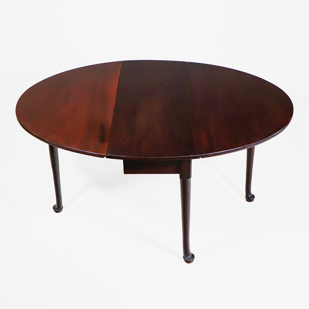 Der Tisch ist im traditionellen Queen-Anne-Stil gestaltet und zeigt die typischen, zierlich geschwungenen Beine mit sanft gerundeten Pad-Füßen. Die warme Mahagoni-Oberfläche verleiht dem Mahagoni Klapptisch eine edle und hochwertige Ausstrahlung. Durch seine ovale Form im geöffneten Zustand wirkt er elegant und harmonisch in jedem Raum.