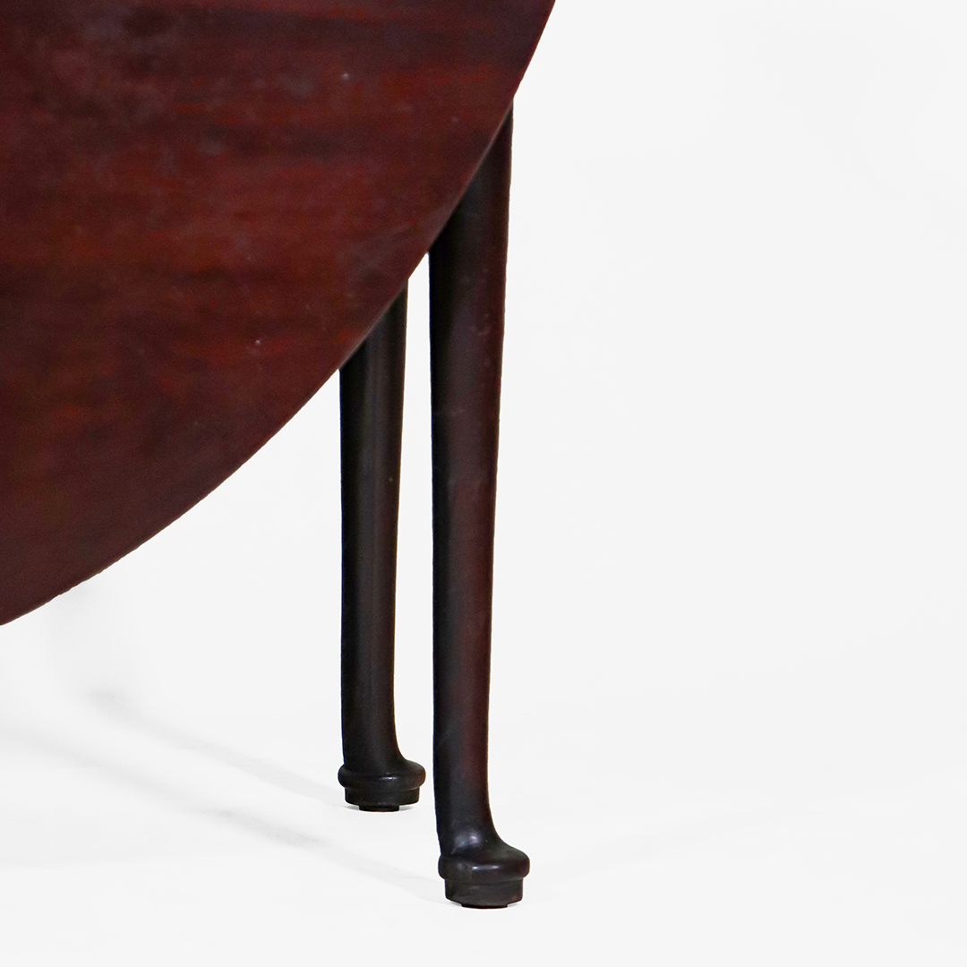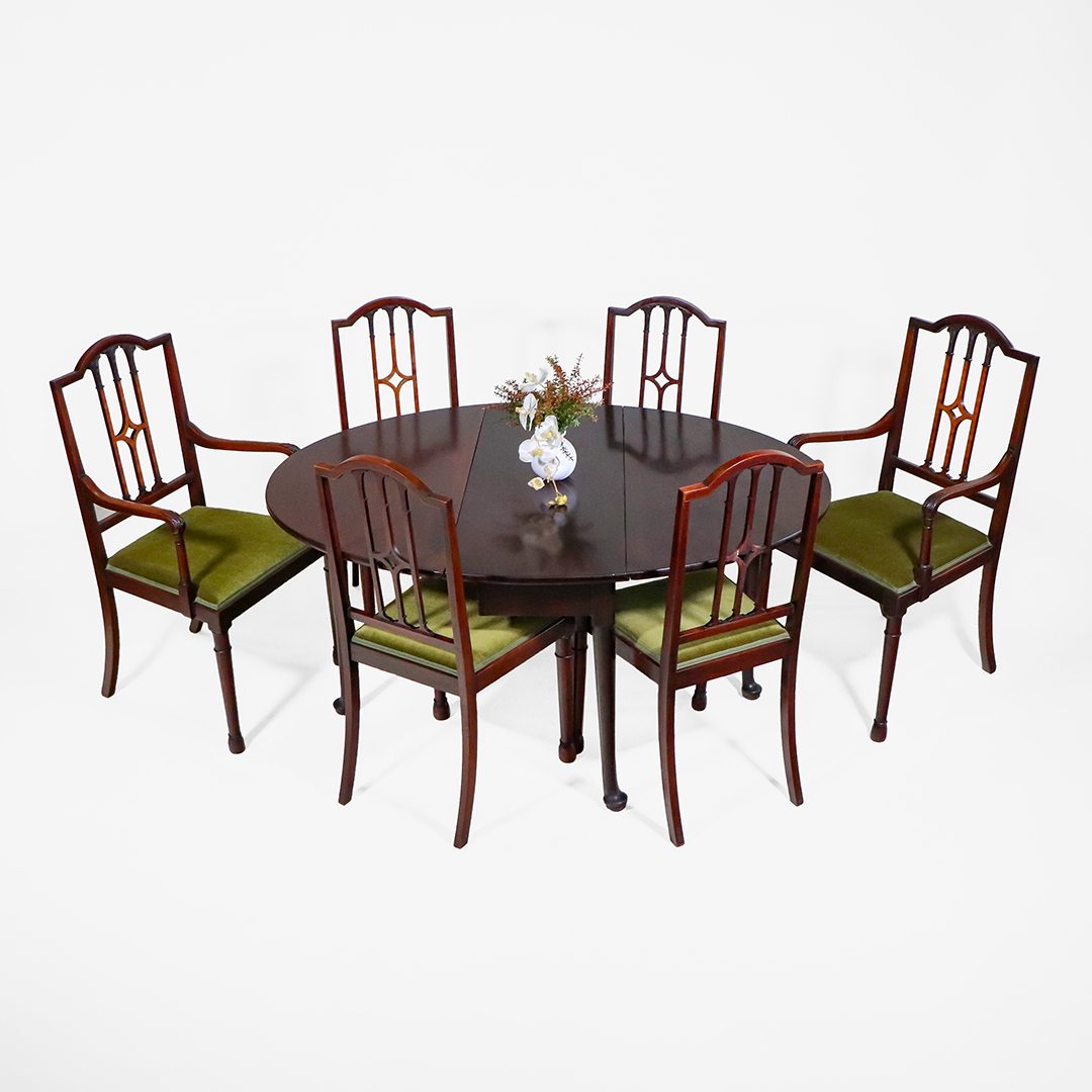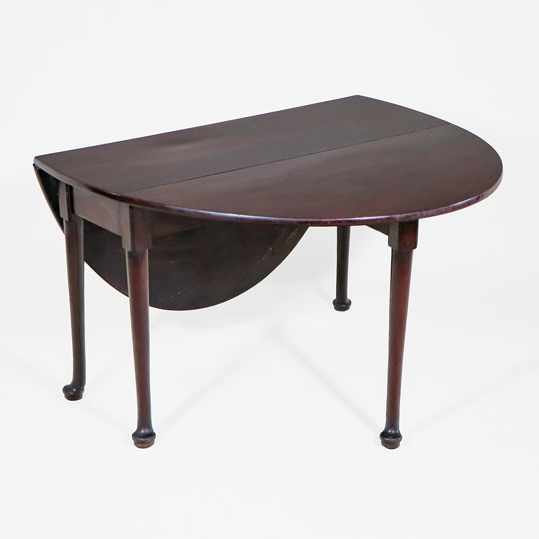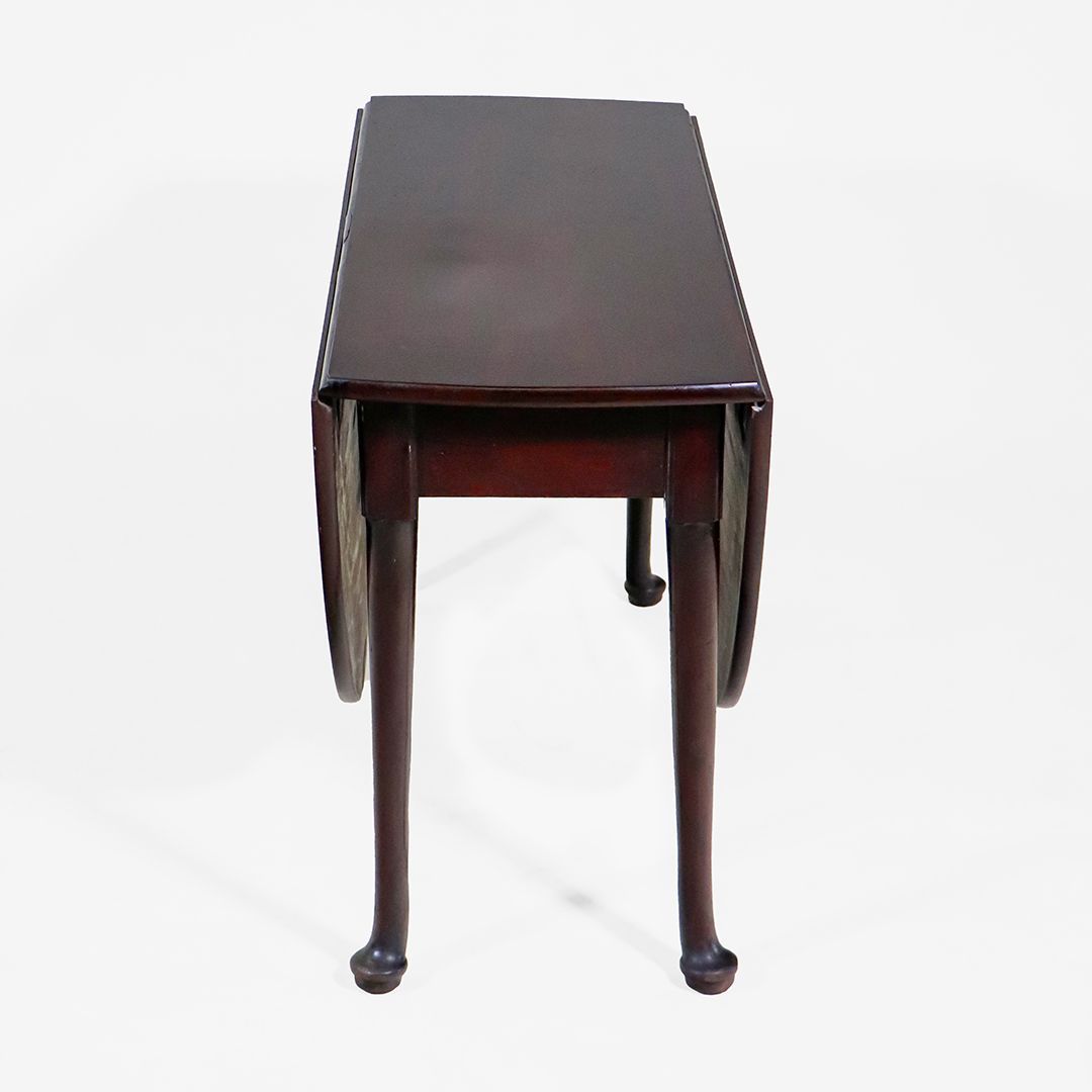 Der Tisch ist im traditionellen Queen-Anne-Stil gestaltet und zeigt die typischen, zierlich geschwungenen Beine mit sanft gerundeten Pad-Füßen. Die warme Mahagoni-Oberfläche verleiht dem Mahagoni Klapptisch eine edle und hochwertige Ausstrahlung. Durch seine ovale Form im geöffneten Zustand wirkt er elegant und harmonisch in jedem Raum.