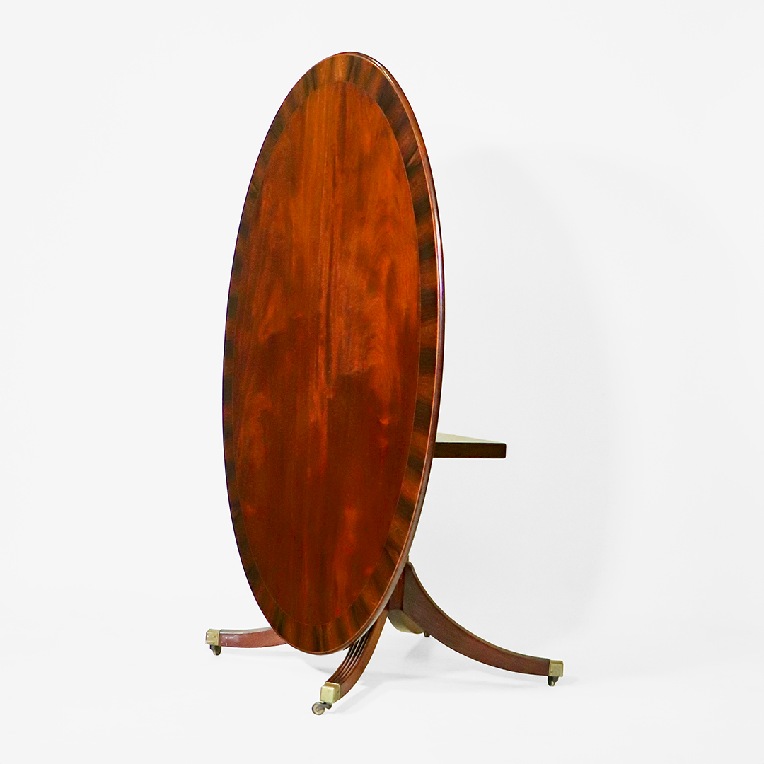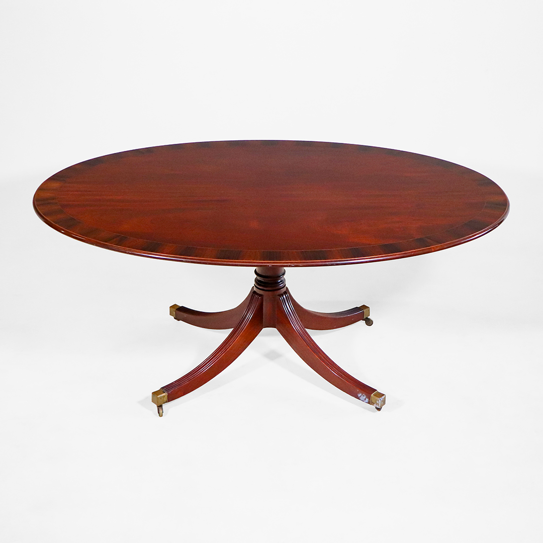 Der Tisch steht in der Tradition hochwertiger englischer Esszimmermöbel. Die ovale Tischplatte zeigt eine besonders schöne Mahagoni-Maserung mit dekorativem Randfurnier. Das zentrale Säulengestell mit vier elegant geschwungenen Füßen ist typisch für den Regency-Stil. Messingrollen verleihen dem Tisch eine feine Note und machen ihn leicht beweglich – ein klassisches Detail vieler englischer Esstische.