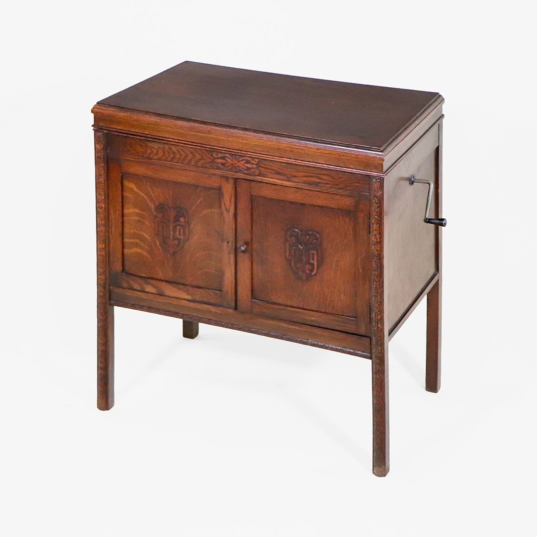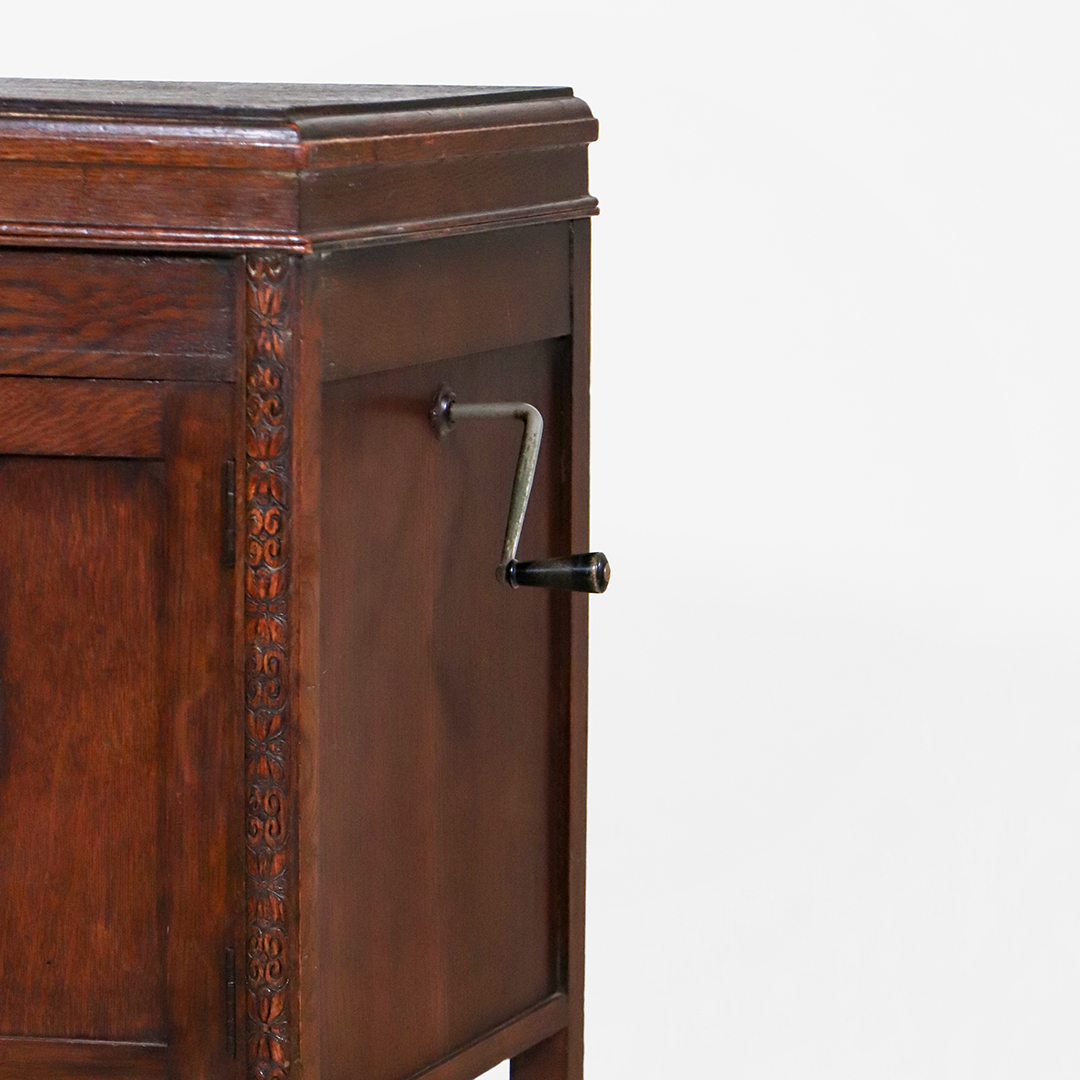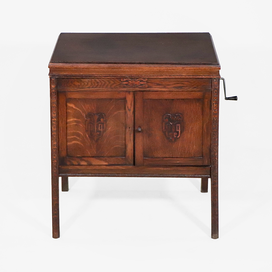 Dieses antike Grammophon verfügt über eine klassische, manuelle Kurbelmechanik. Der Plattenteller und der Tonarm befinden sich geschützt im Inneren des Schranks. Die Schallführung erfolgt über einen integrierten Schalltrichter, der den Klang nach außen leitet – typisch für hochwertige Grammophonschränke dieser Epoche.