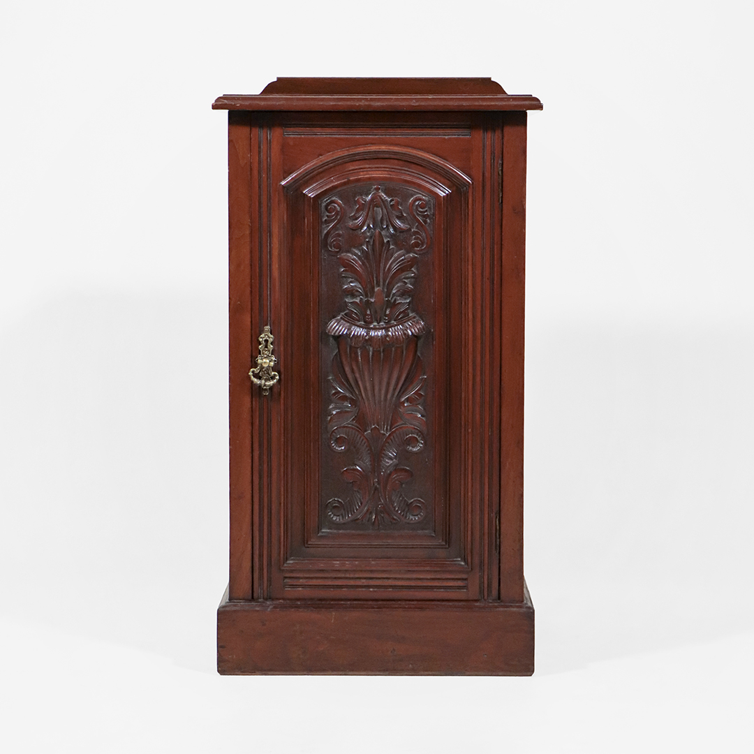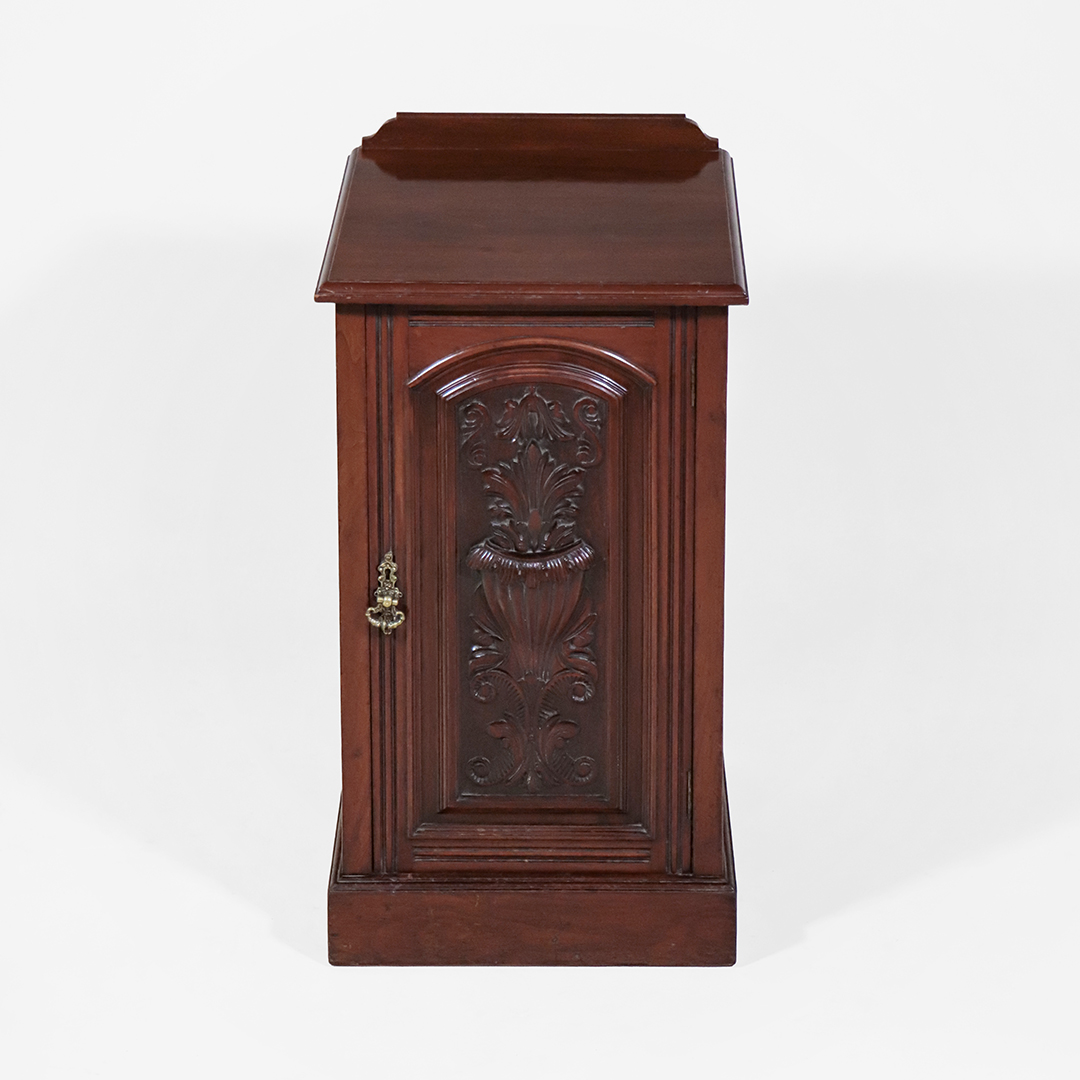 Massivholz Mahagoni Nachttische im viktorianischen Stil mit aufwendig geschnitzter Tür