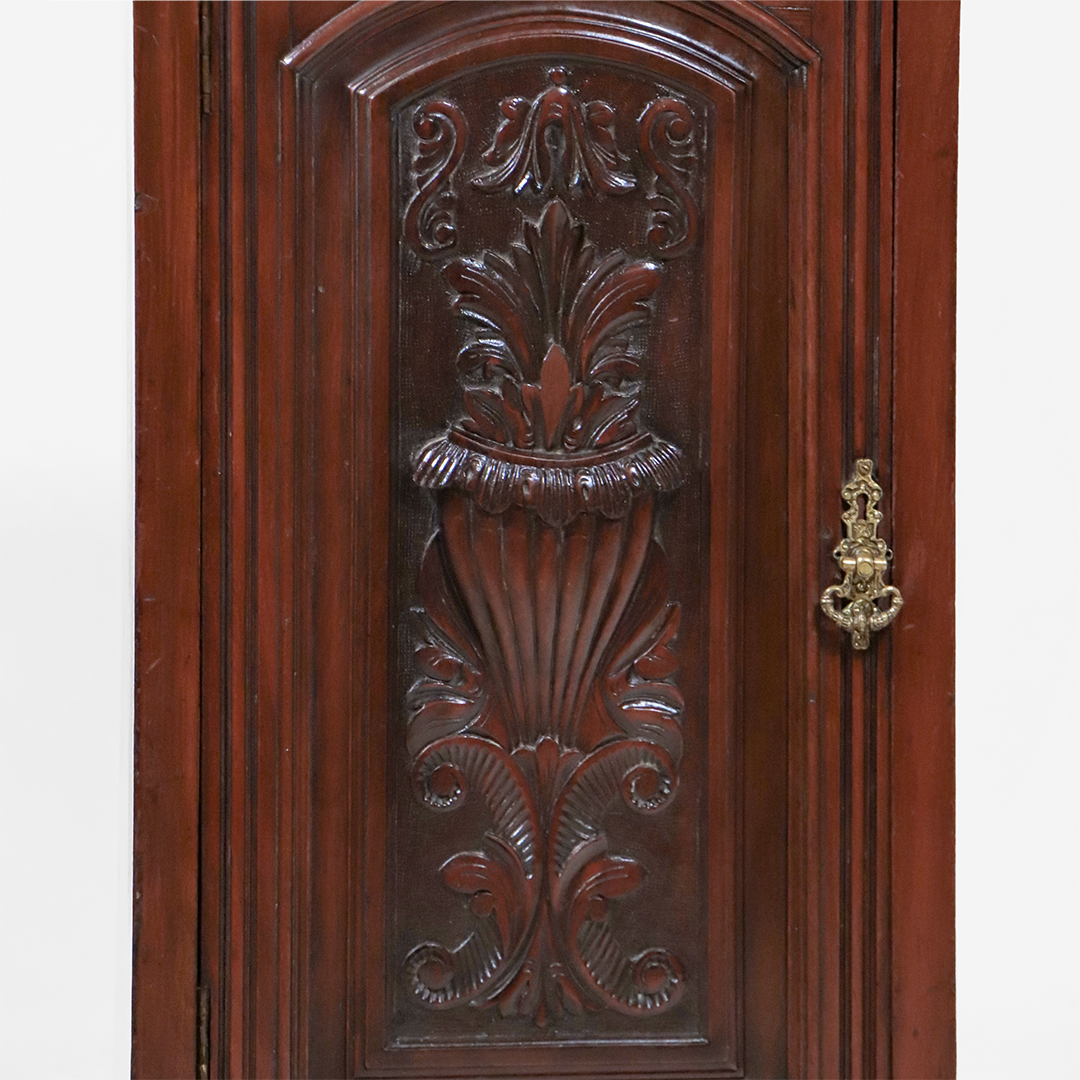 Die Front wird von einer großflächigen, dreidimensional gearbeiteten Schnitzerei geprägt: florale Motive mit klar herausgearbeiteten Höhen und Tiefen, die je nach Lichteinfall lebendig wirken. Die originalen Messingbeschläge setzen einen stilvollen Akzent und unterstreichen den authentischen Charakter dieser Möbelstücke.