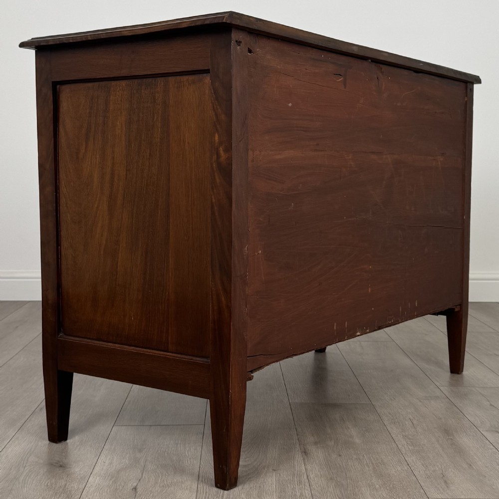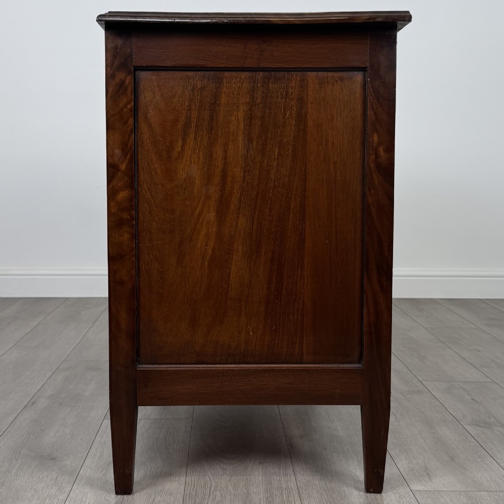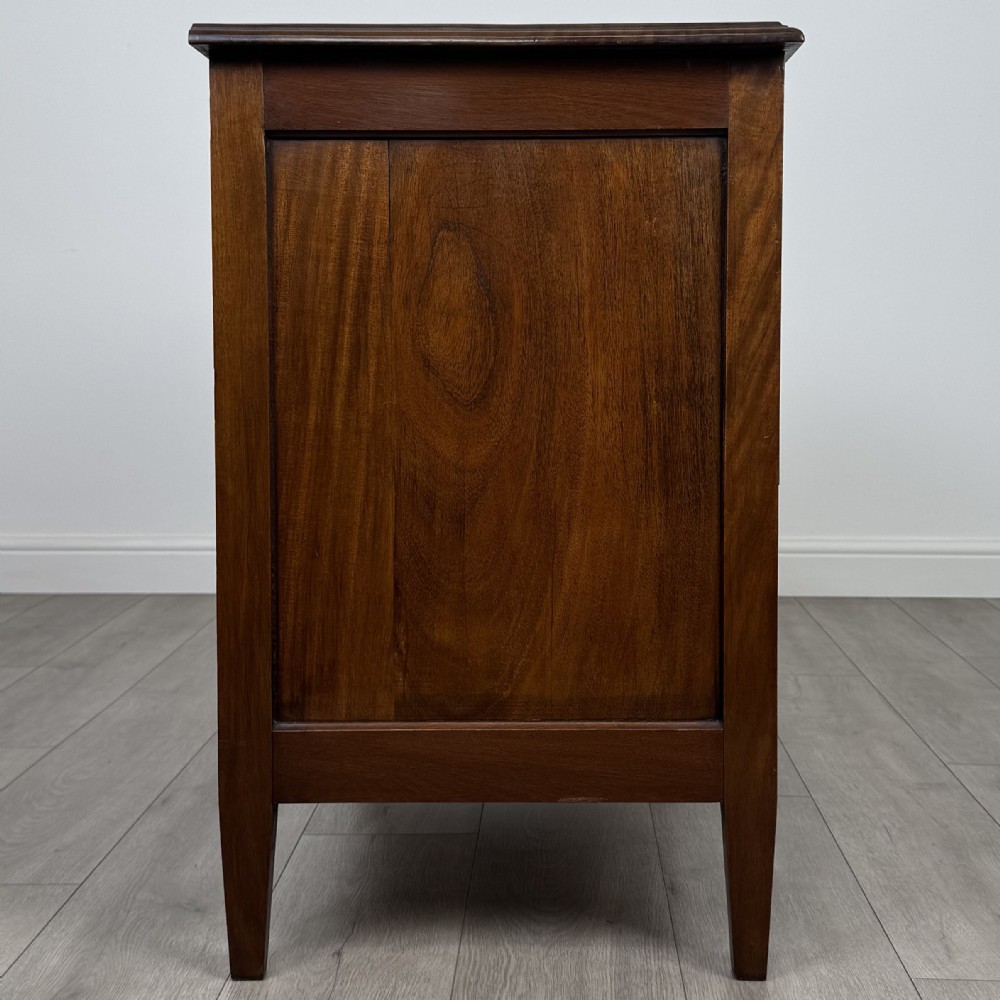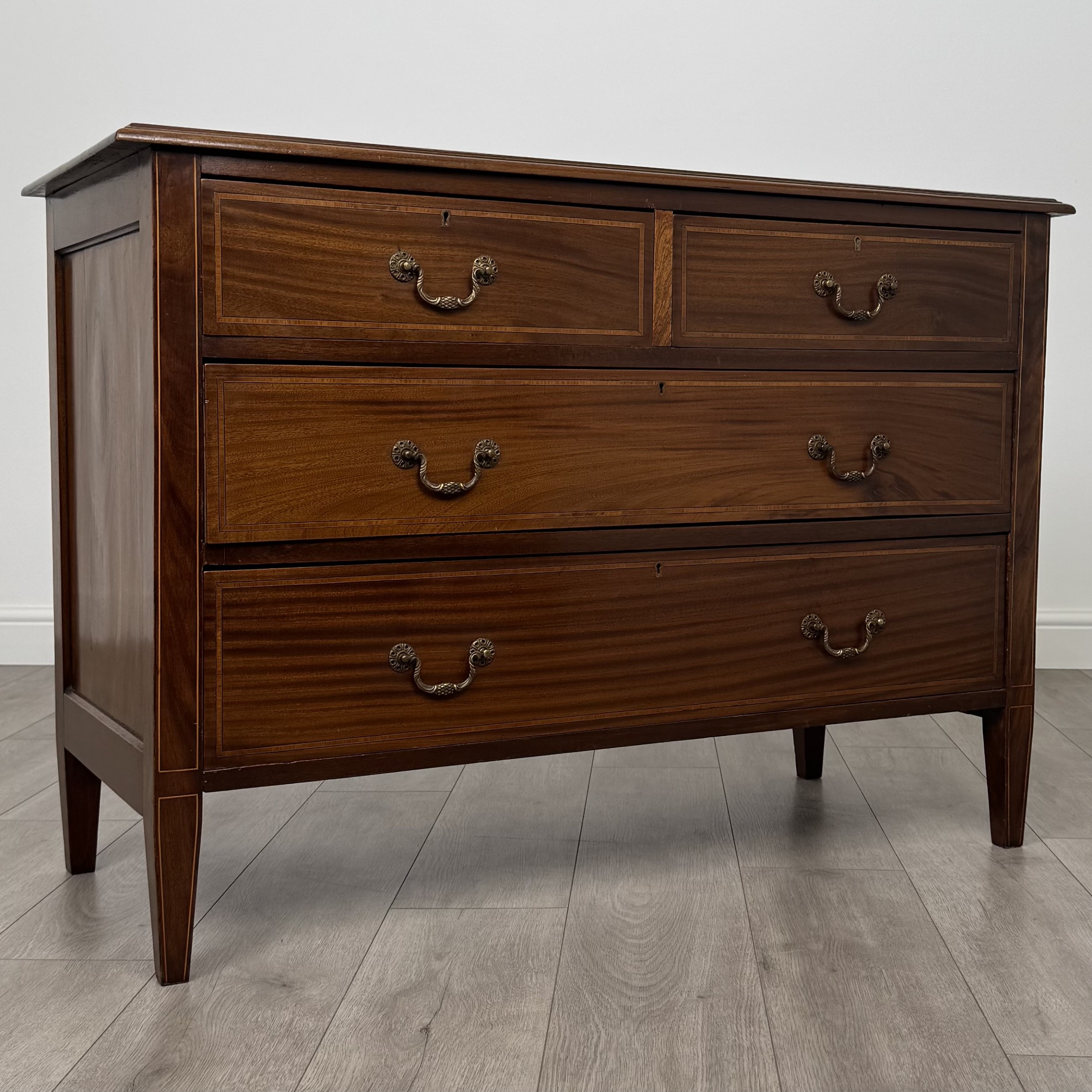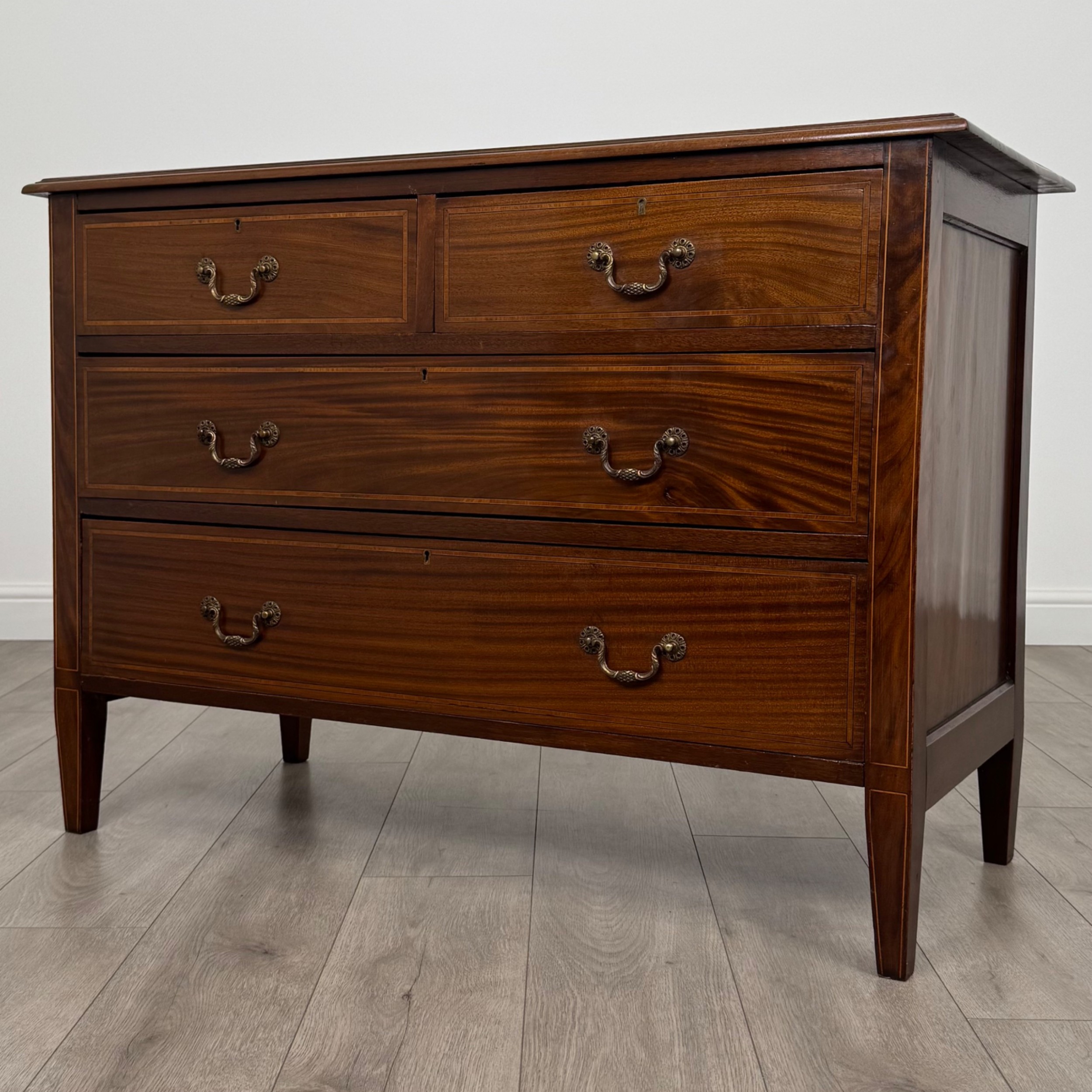 Diese antike Mahagoni Kommode aus dem Edwardian Zeitalter überzeugt durch ihre klassische Eleganz und sorgfältige Handwerkskunst. Das Stück steht auf konisch zulaufenden Beinen, die seine feine Silhouette unterstreichen, während die ausgewogenen Proportionen und feinen Details die Qualität des Designs widerspiegeln.
