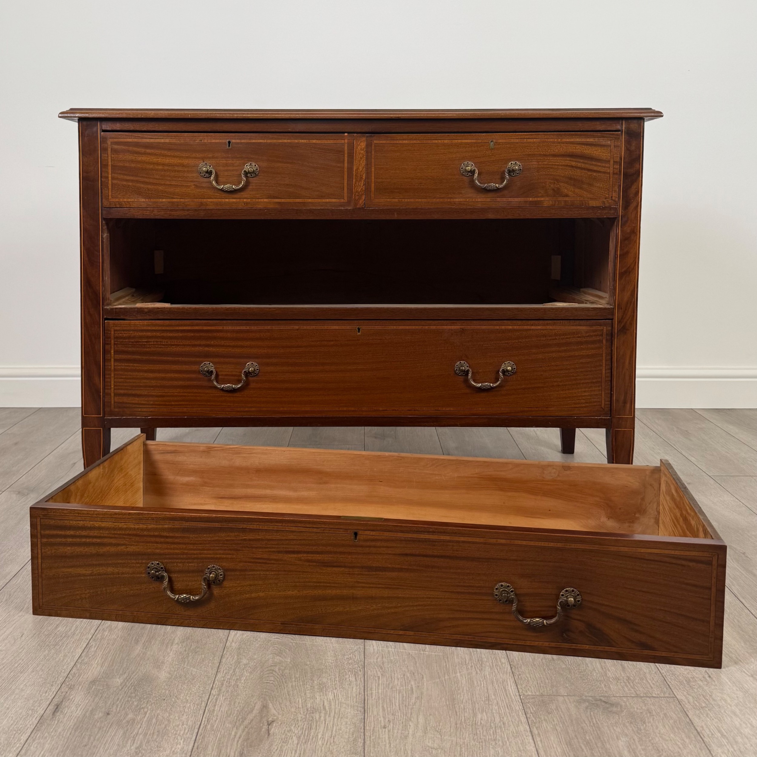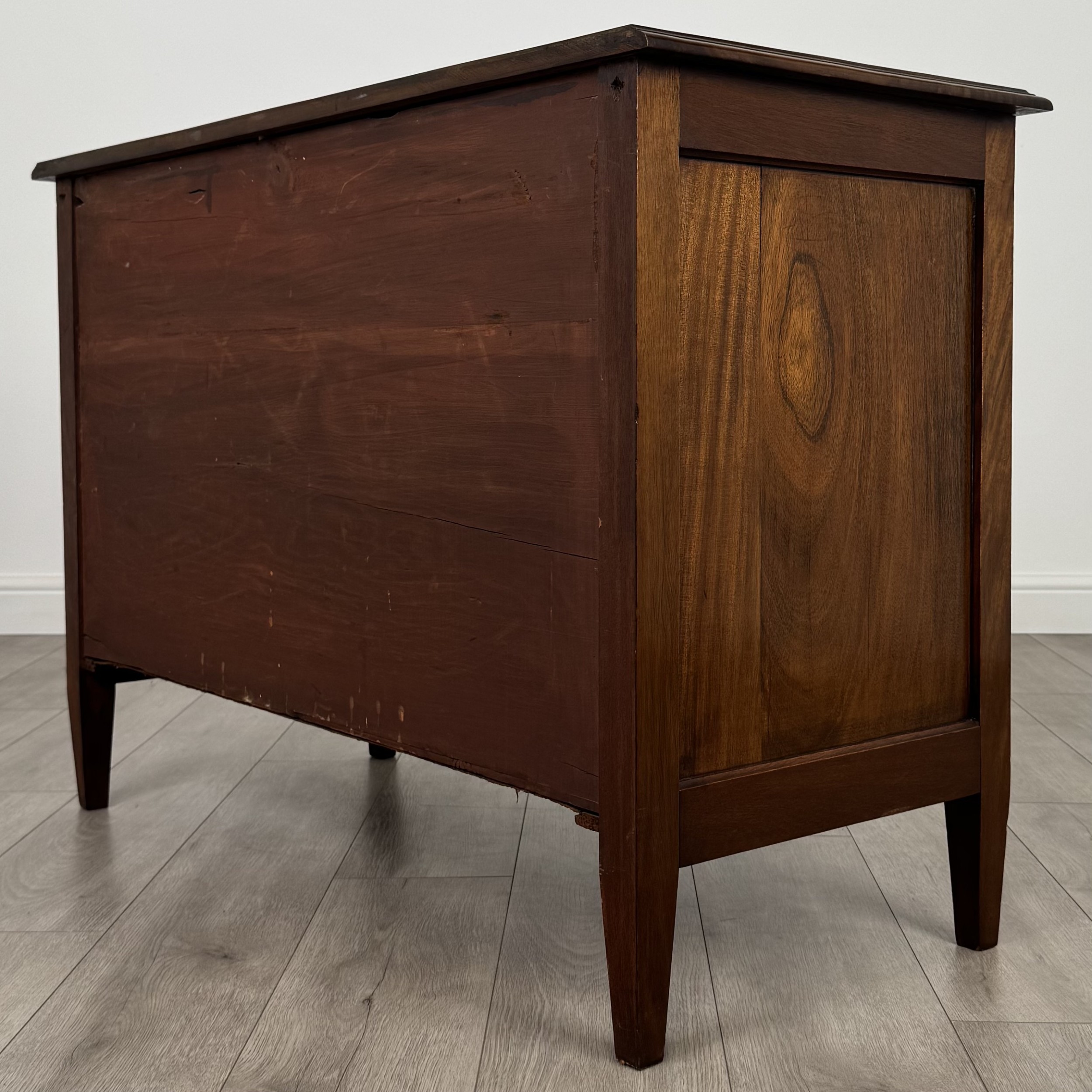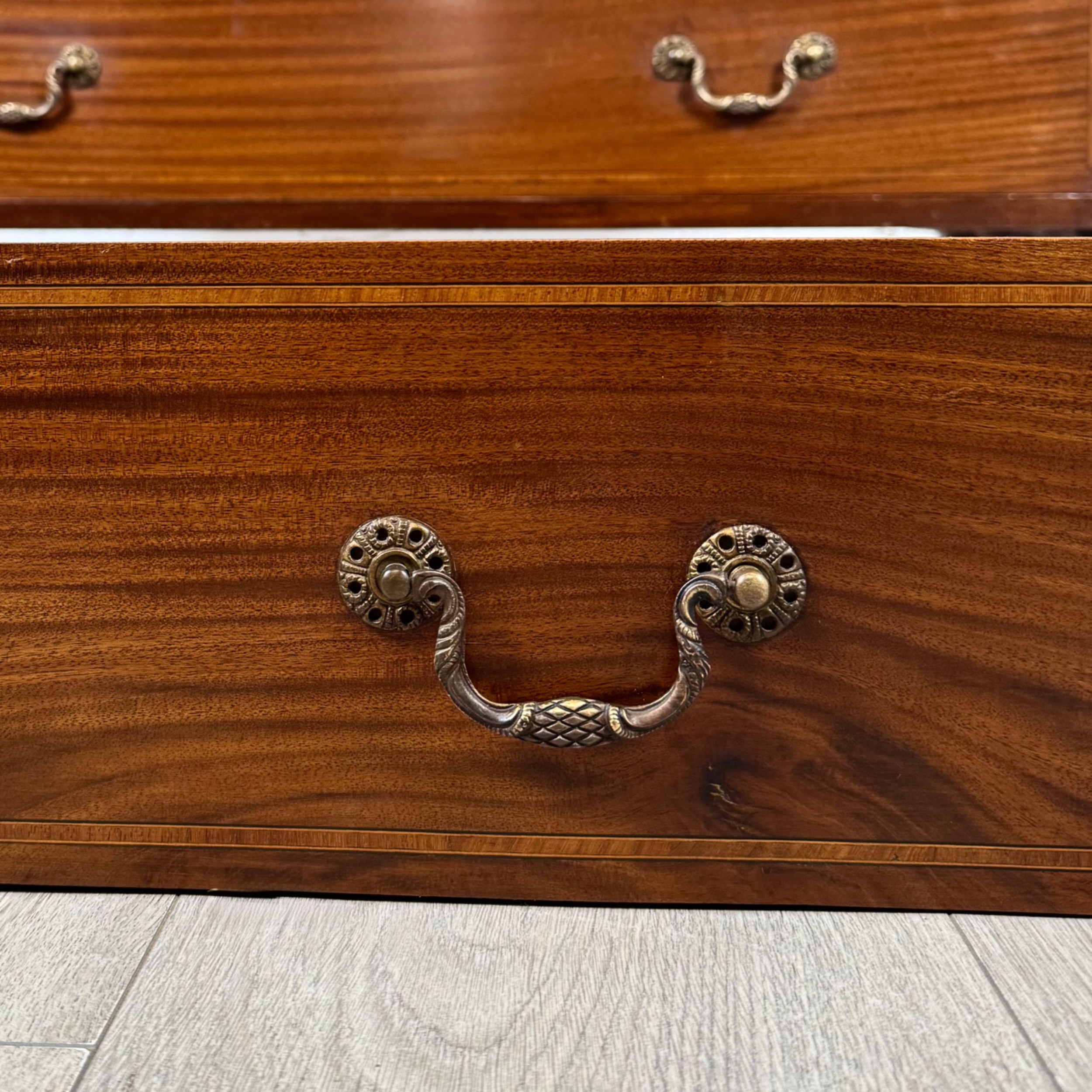 Die Kommode verfügt über insgesamt vier Schubladen – zwei kleinere im oberen Bereich sowie zwei größere darunter. Jede Schublade ist mit den originalen Messinggriffen versehen, die perfekt mit den warmen Farbtönen des Mahagoni harmonieren.