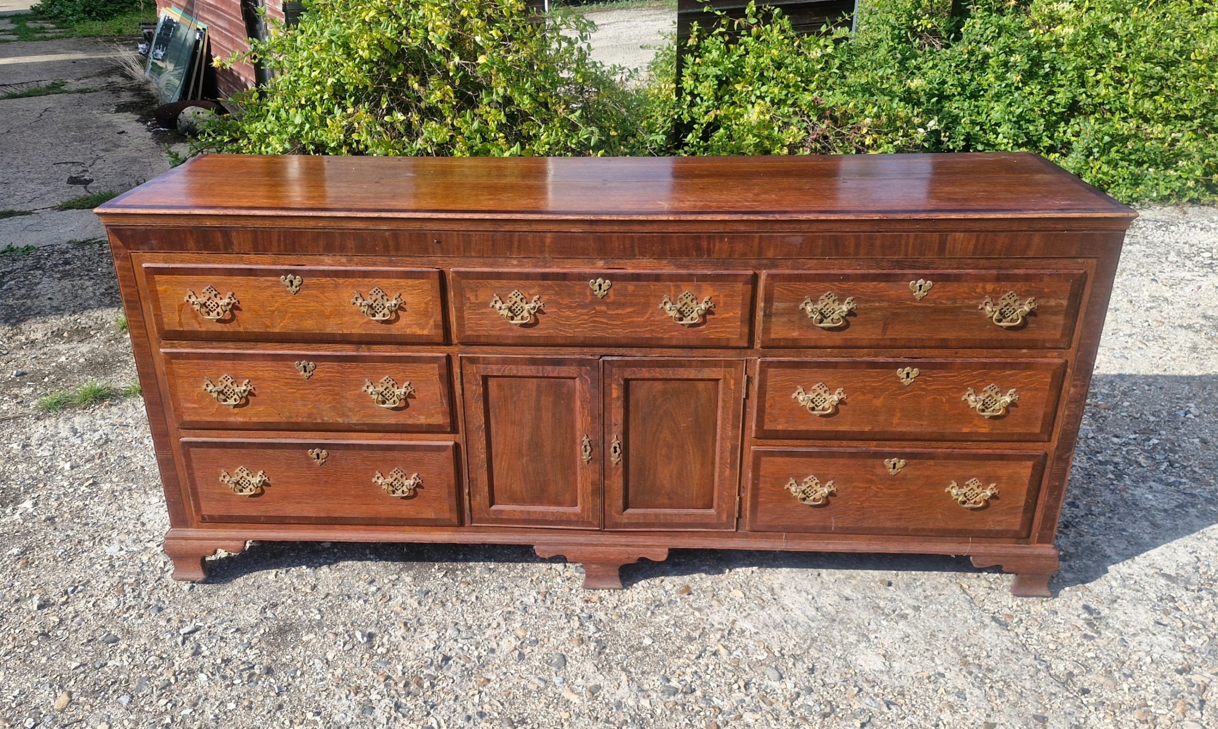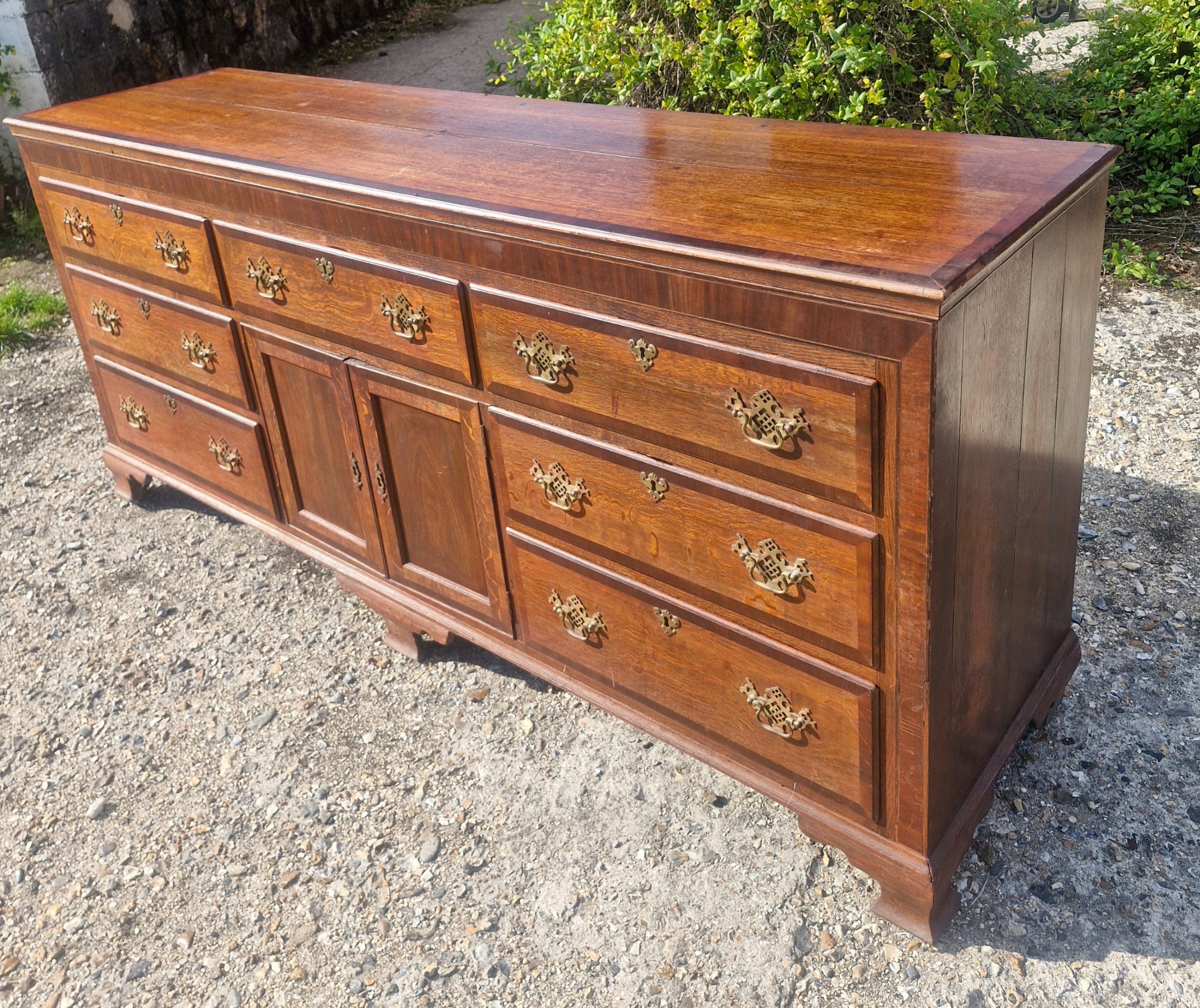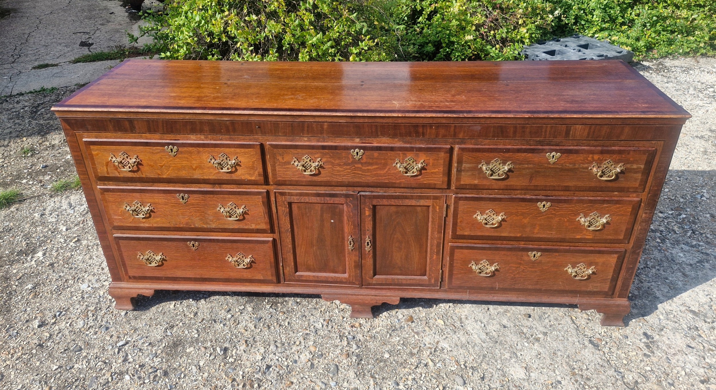 Mit einer Breite von über zwei Metern bietet diese große Kommode antik reichlich Stauraum und ist damit sowohl funktional als auch dekorativ. Das Möbelstück ruht auf einem stabilen Sockel und wirkt dank der klaren Linien und des massiven Holzes besonders harmonisch.