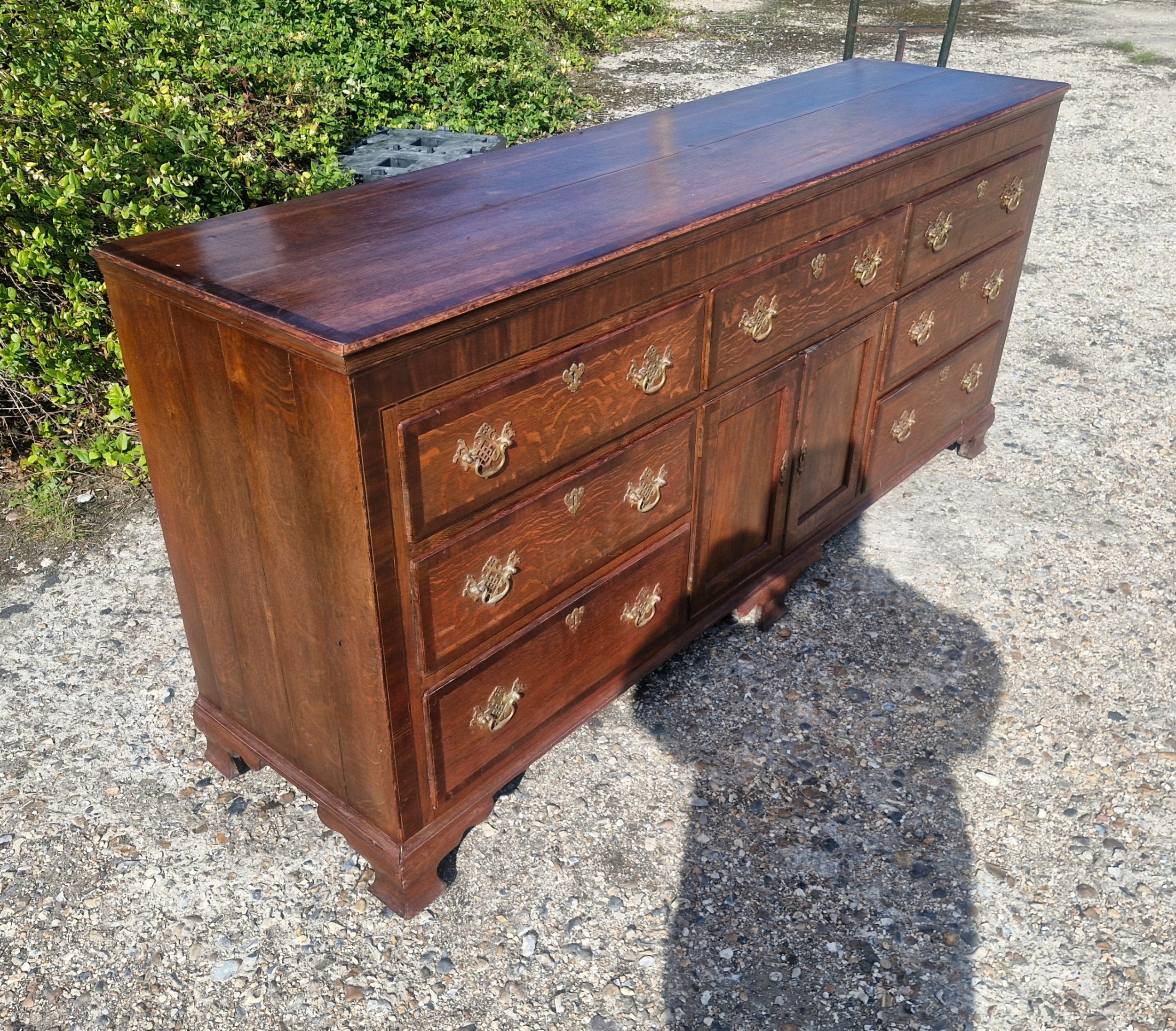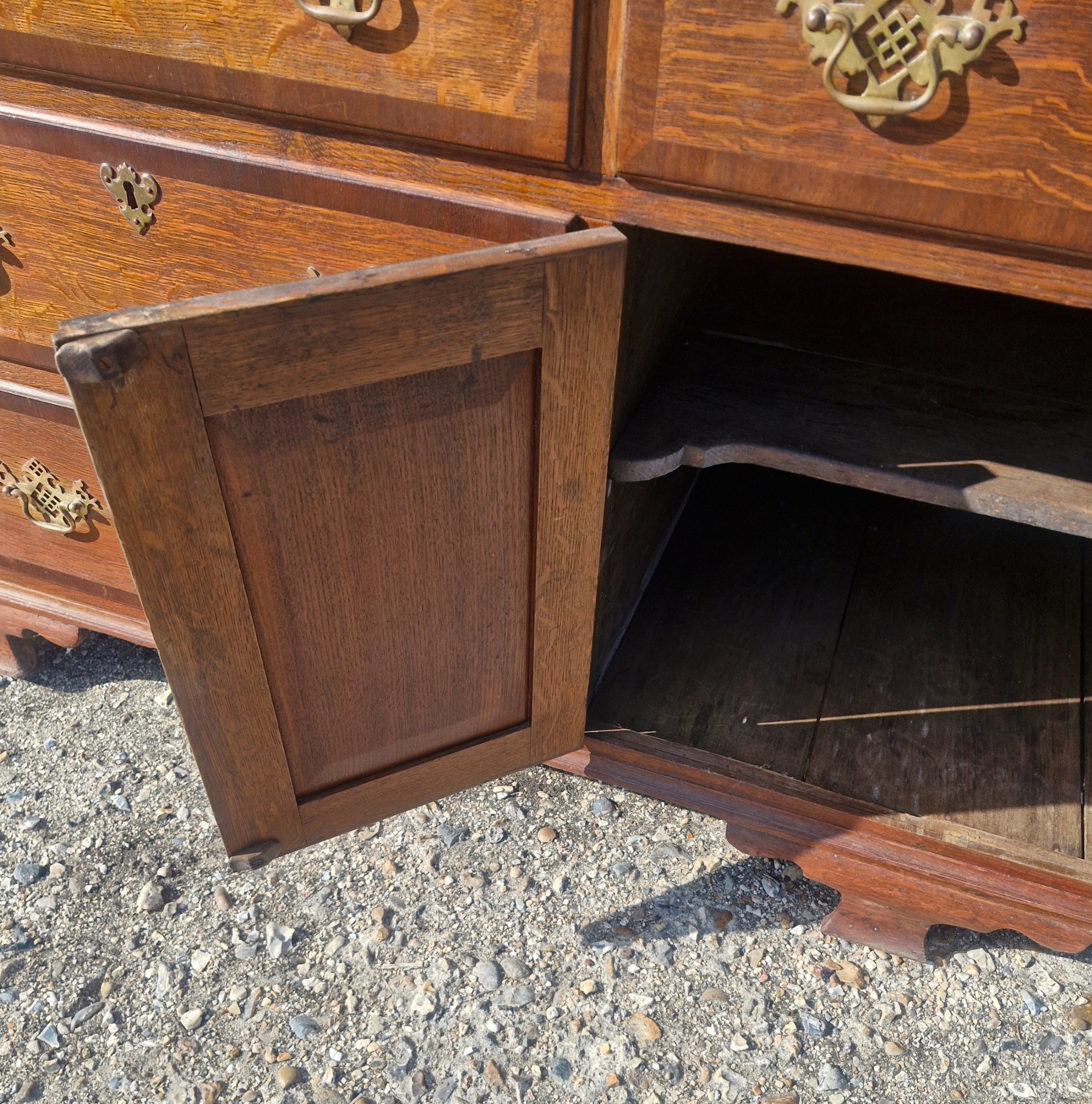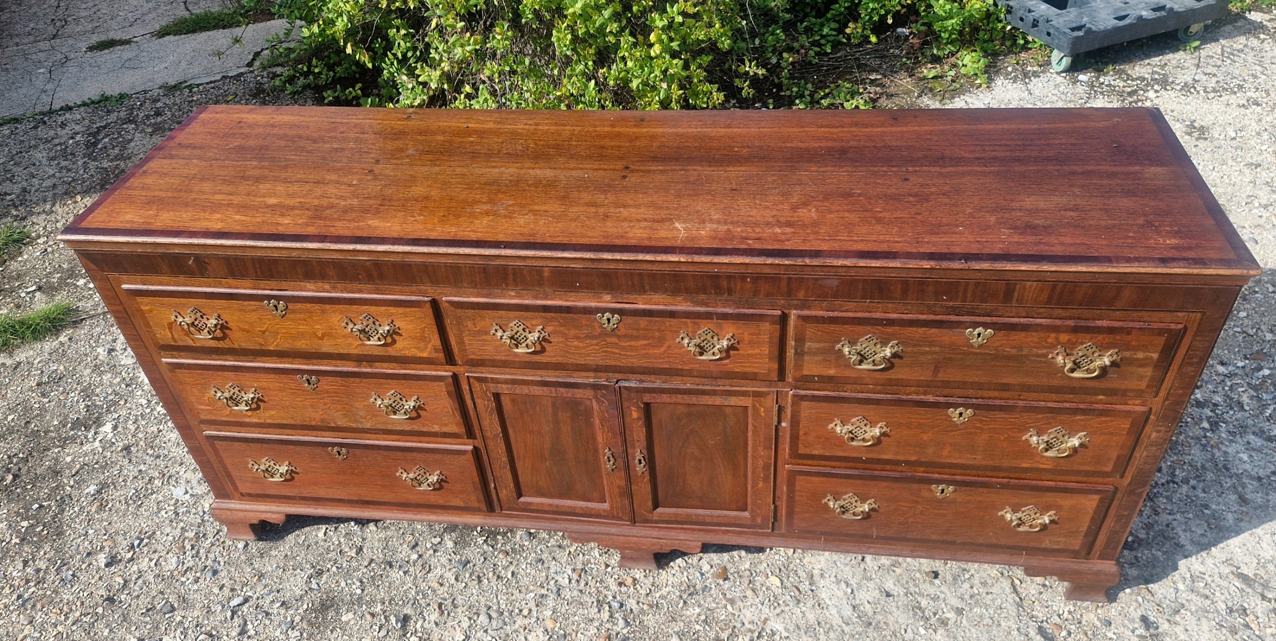 Mit einer Breite von über zwei Metern bietet diese große Kommode antik reichlich Stauraum und ist damit sowohl funktional als auch dekorativ. Das Möbelstück ruht auf einem stabilen Sockel und wirkt dank der klaren Linien und des massiven Holzes besonders harmonisch.