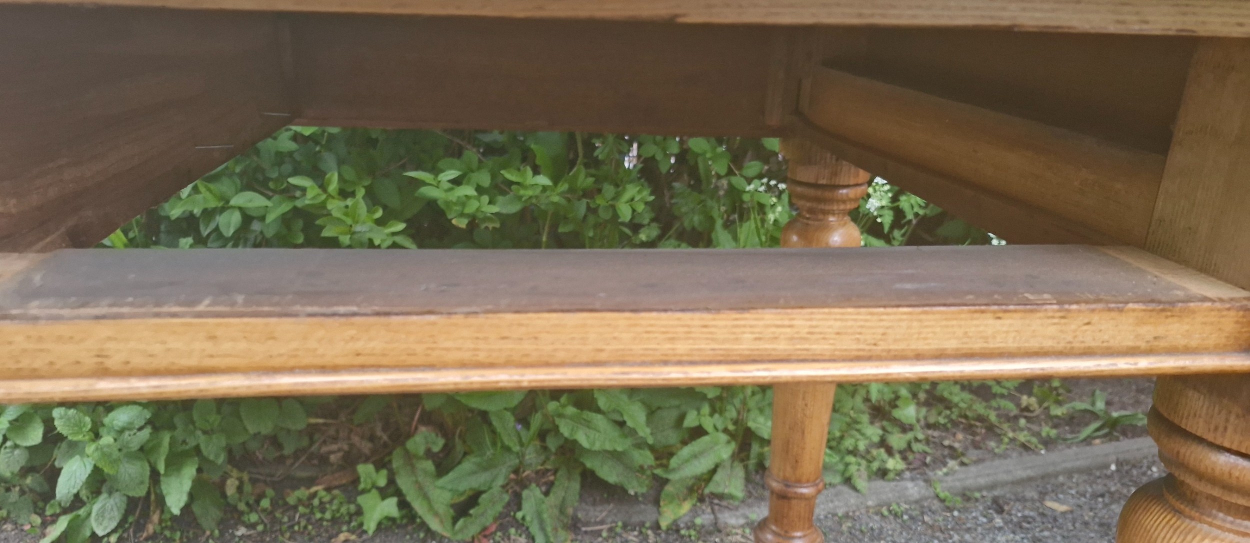 Die beiden Schubladen sind leichtgängig und bieten viel Stauraum für Schreibutensilien oder Dokumente. Die Eiche zeigt eine wunderschöne, gereifte Patina – ein Zeichen echter Handwerkskunst und Qualität.