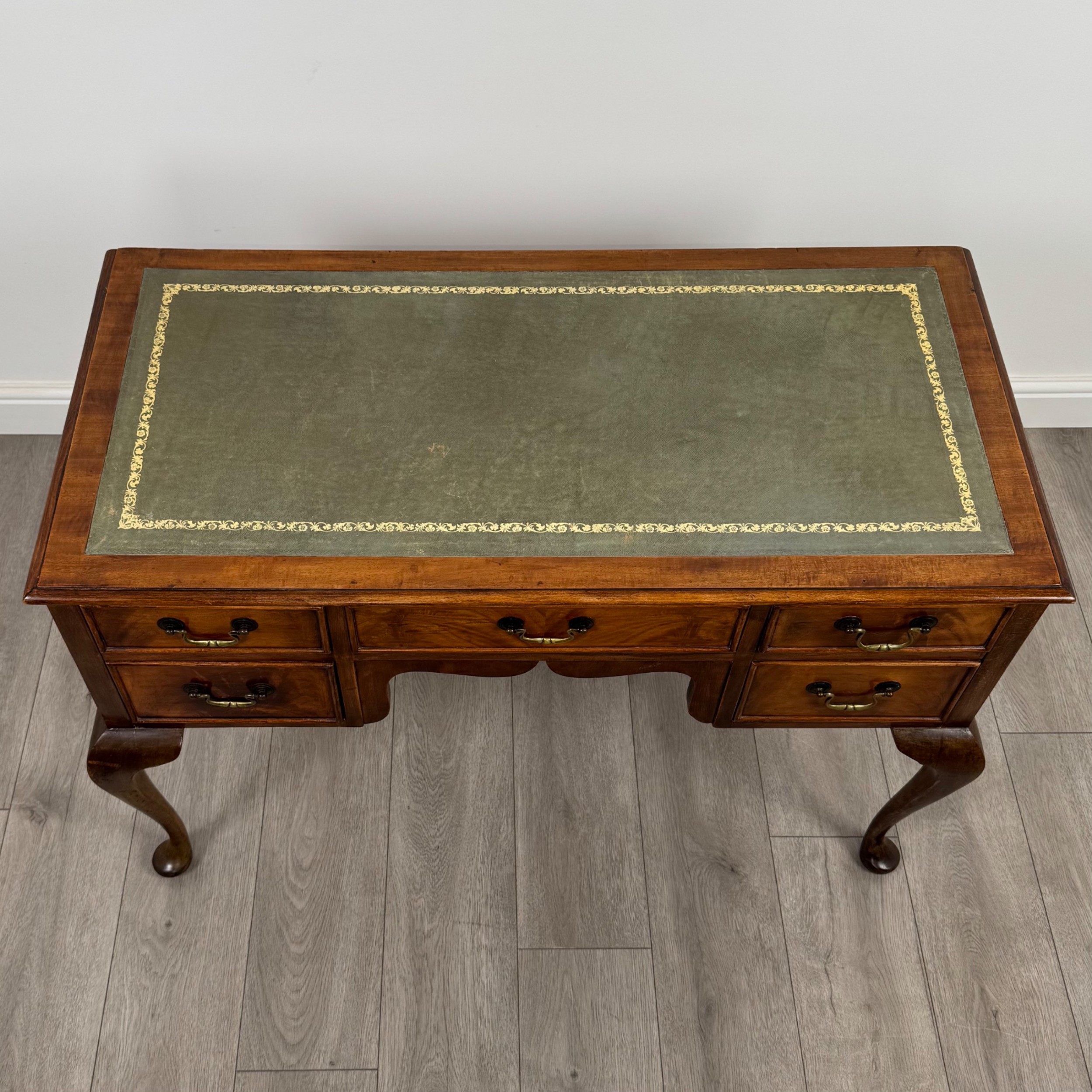 Dieser antike Schreibtisch aus dem frühen 20. Jahrhundert wurde aus edlem Mahagoni gefertigt und überzeugt durch seine warme Farbe und die charaktervolle Maserung des Holzes. Die grüne Leder-Schreibfläche bildet einen stilvollen Kontrast und sorgt für eine angenehme Arbeitsfläche.