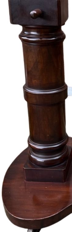 Dank der praktischen Höhenverstellung sowie der neigbaren Tischfläche lässt sich der Tisch optimal an Ihre Bedürfnisse anpassen. Der gedrechselte Mittelschaft verbindet die Tischplatte elegant mit dem dreifüßigen Plattformfuß auf Rollen, was Mobilität und Stabilität vereint.