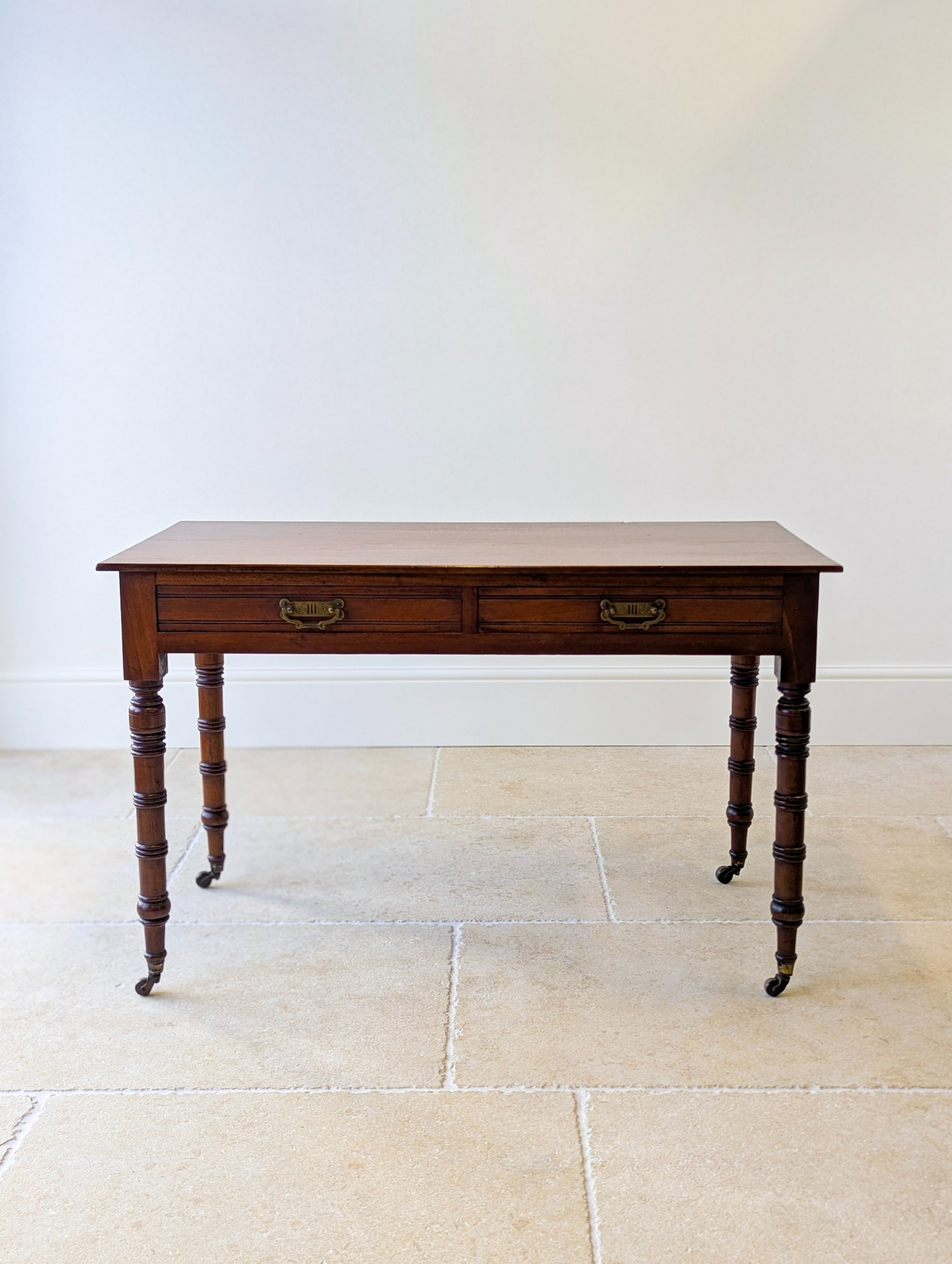 Unter der Platte befinden sich zwei Schubladen, ausgestattet mit den originalen gepressten Messing-Bügelgriffen, die einen feinen Hauch von formaler Eleganz und historischem Charme vermitteln.